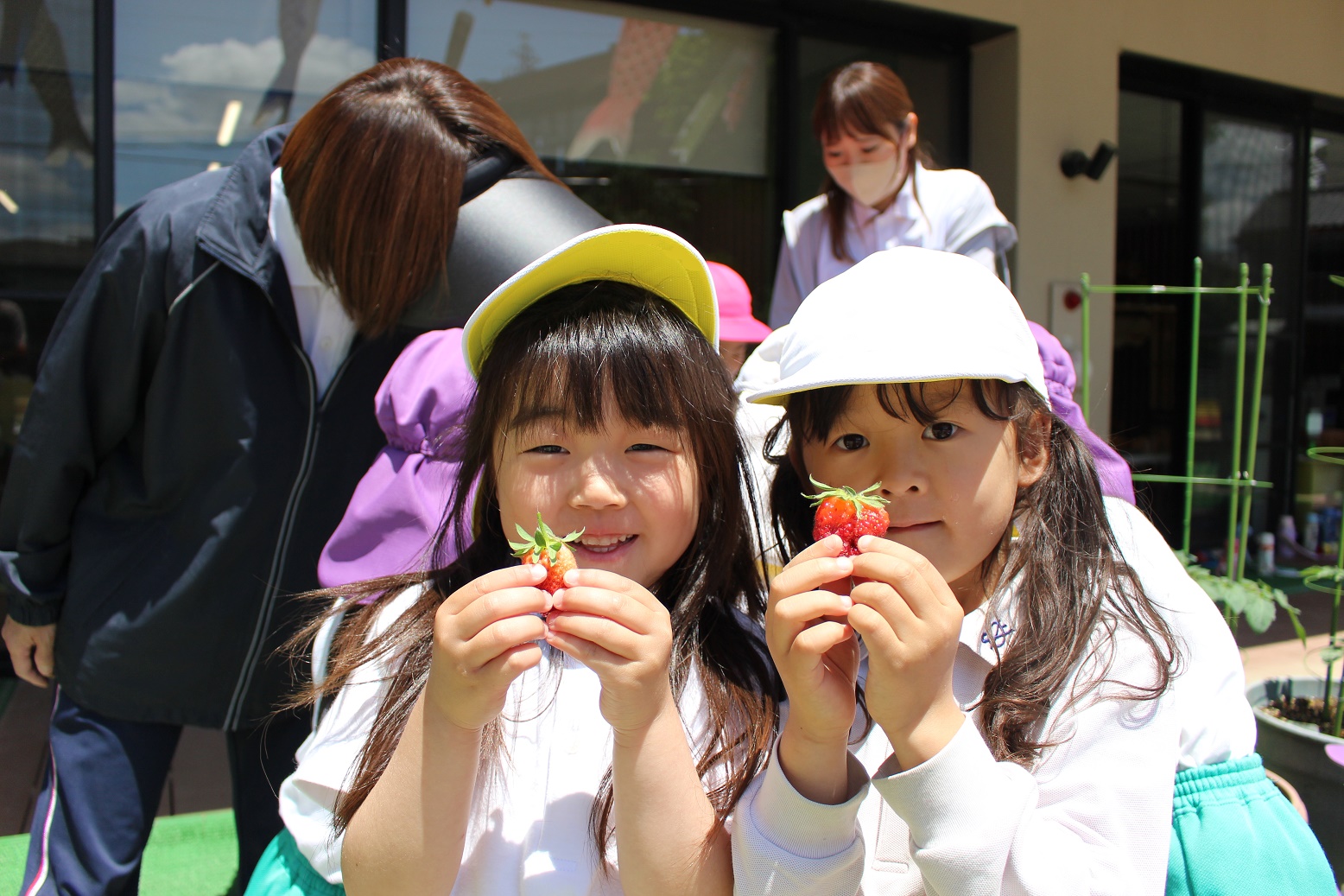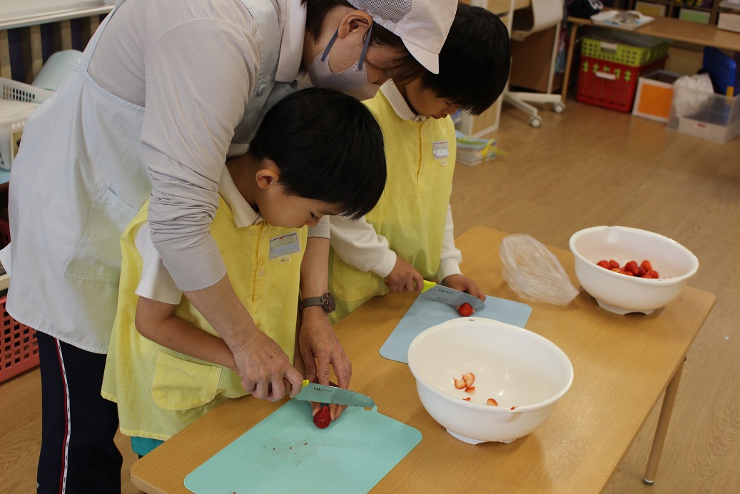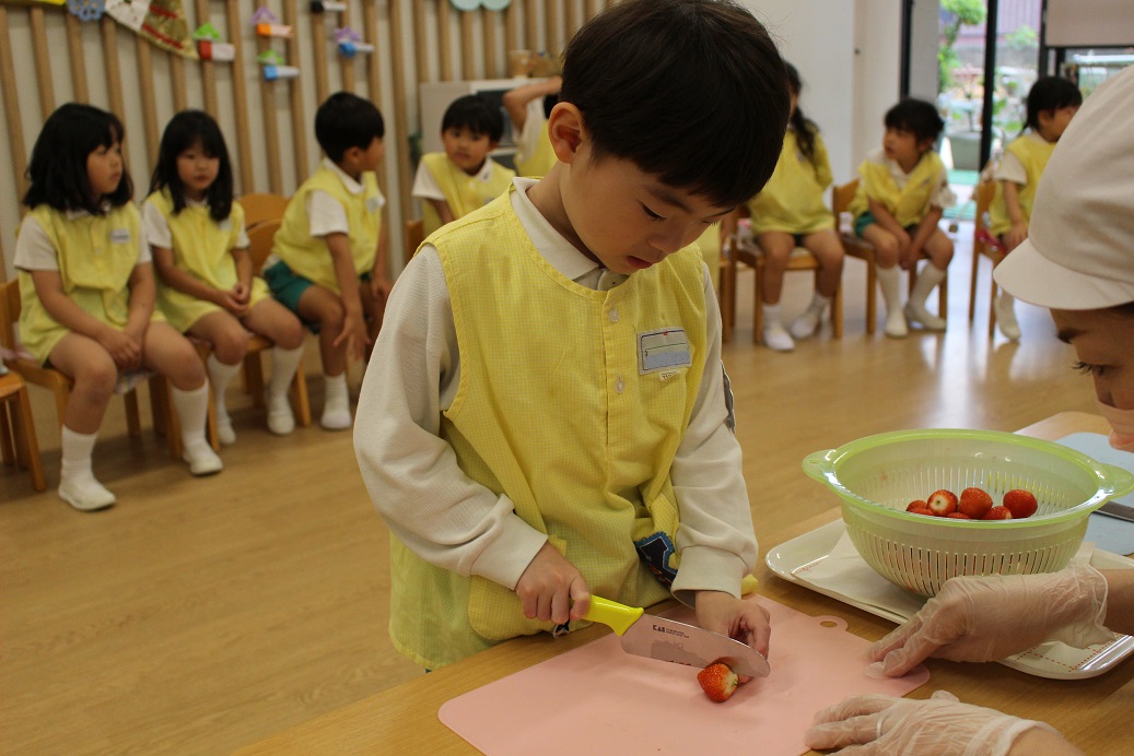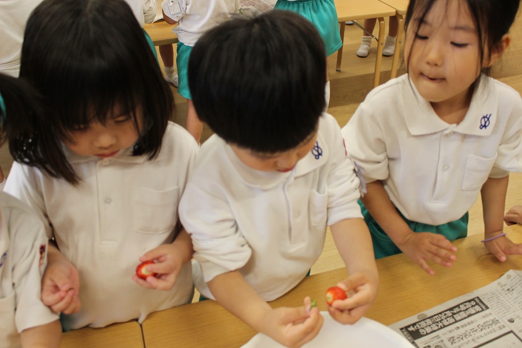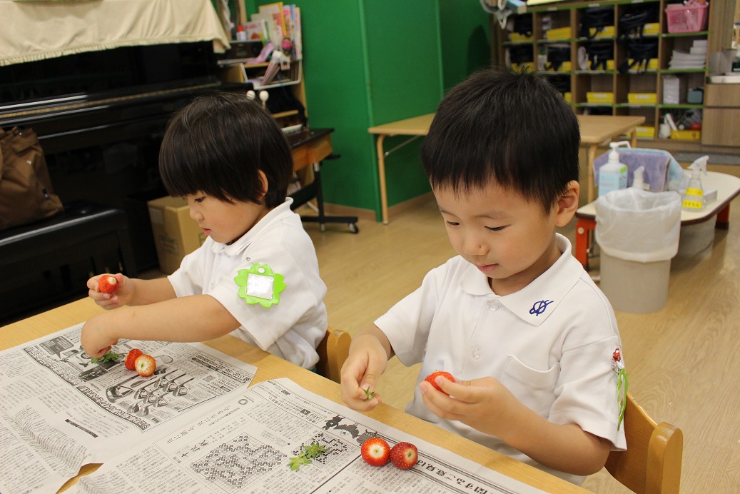 園庭で収穫したいちごを年中組さんが洗って、ヘタを取ってくれました。