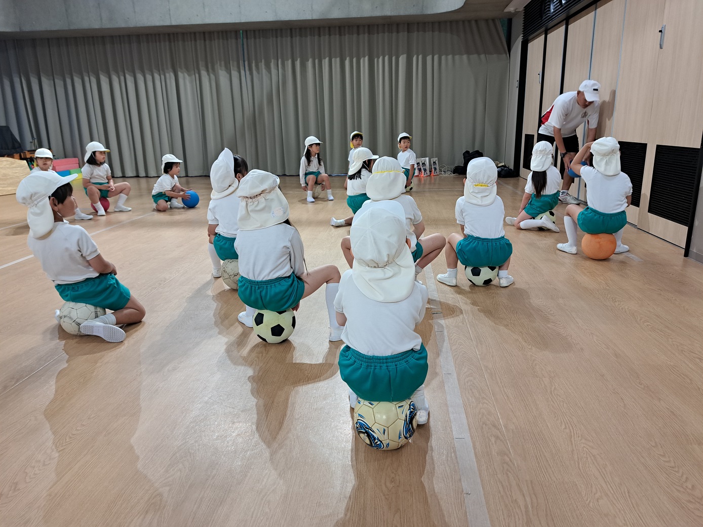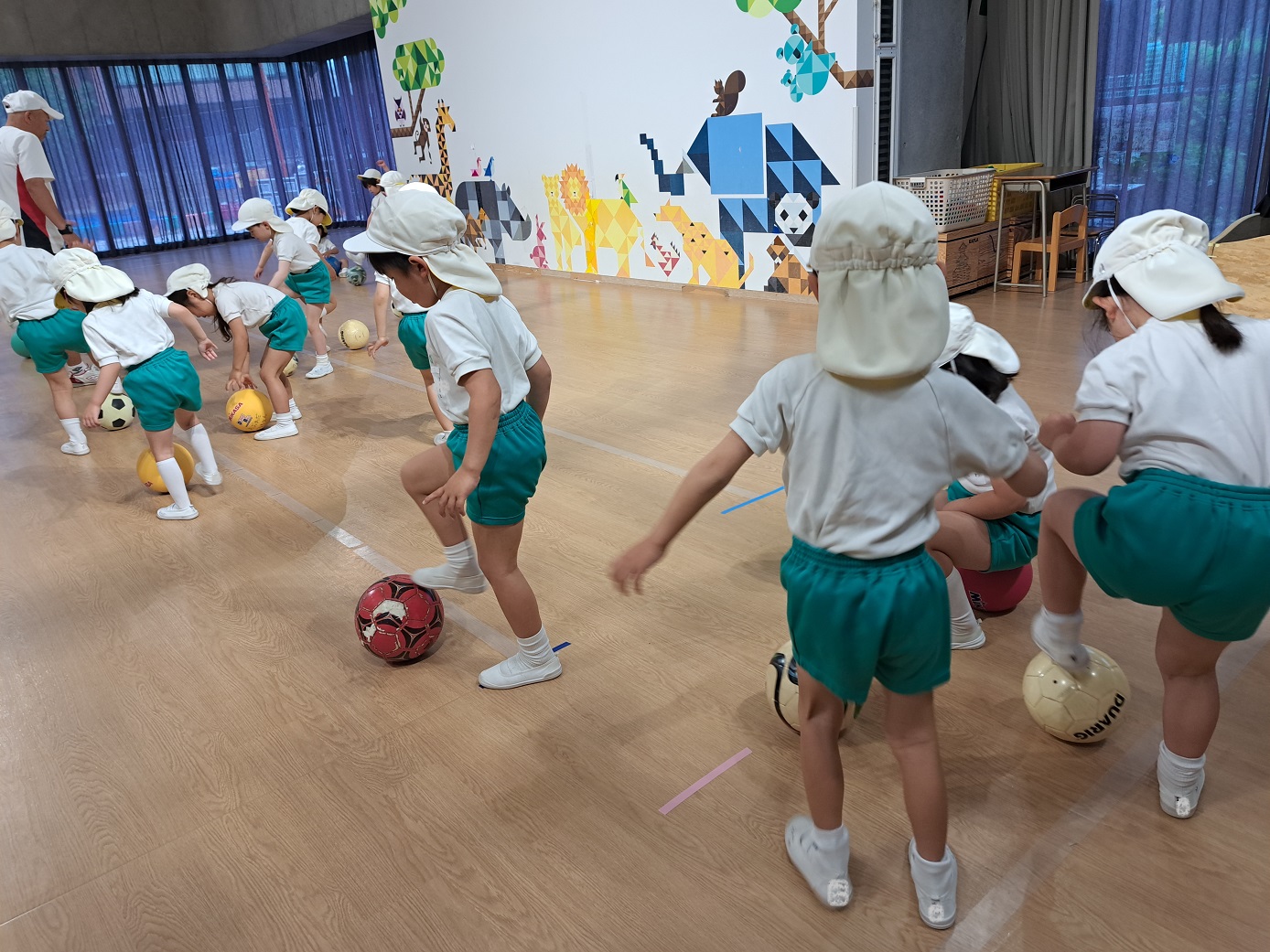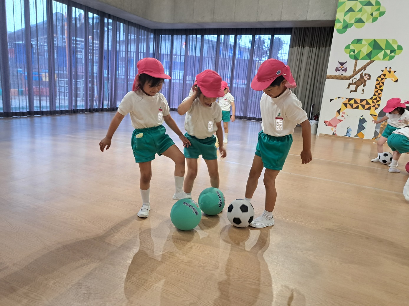 年長組になってはじめてのサッカーは雨だったので、今回は幼稚園ホールで行ないました!