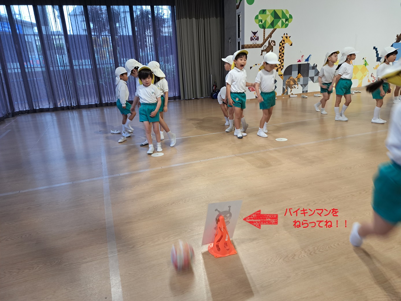 バイキンマンをねらってボールを蹴ったり、自分の足元でボールを転がしたりして楽しみました!