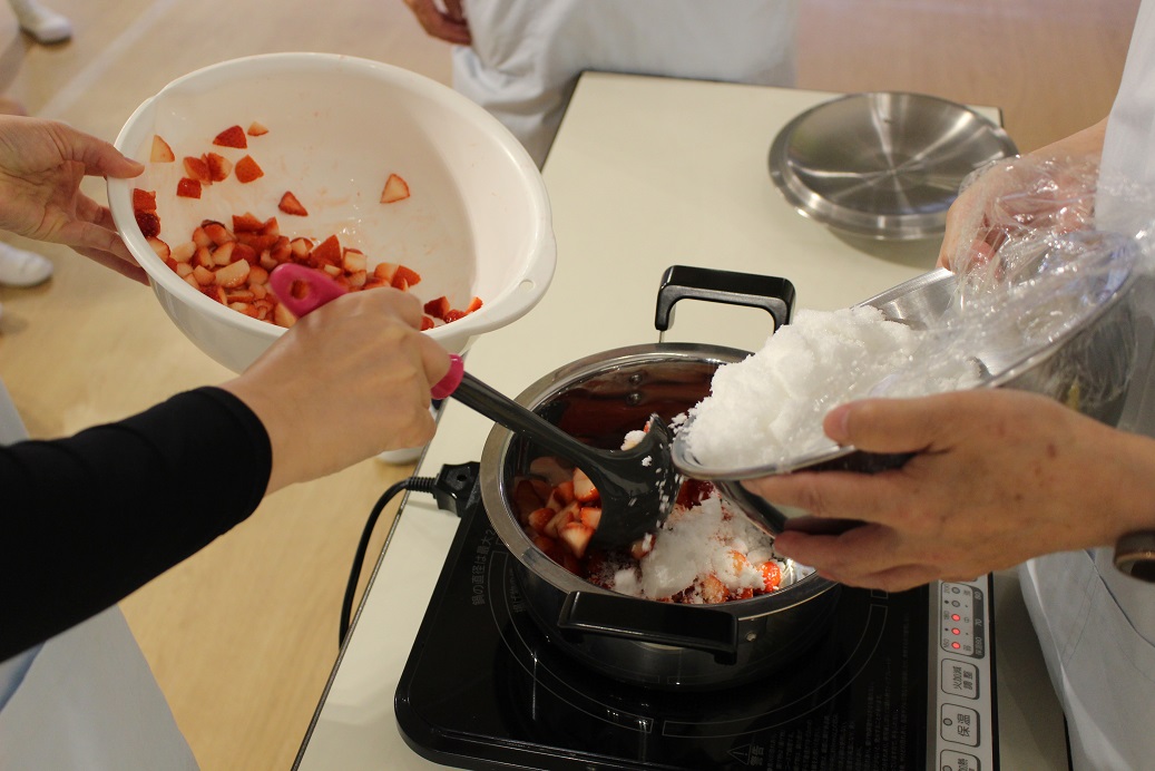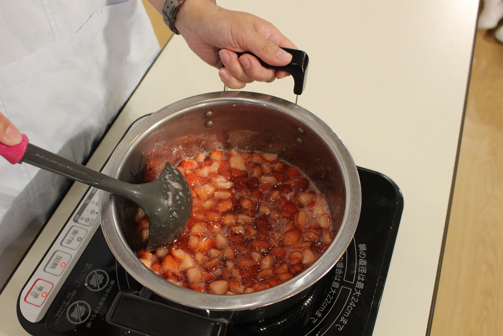 今日作った"いちごジャム"は、明日の給食で、パンにつけて食べる予定です。