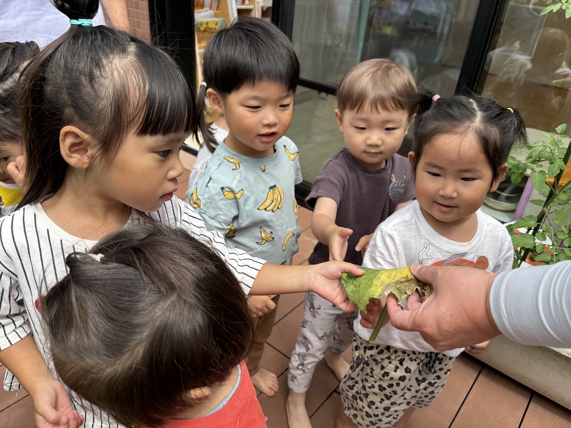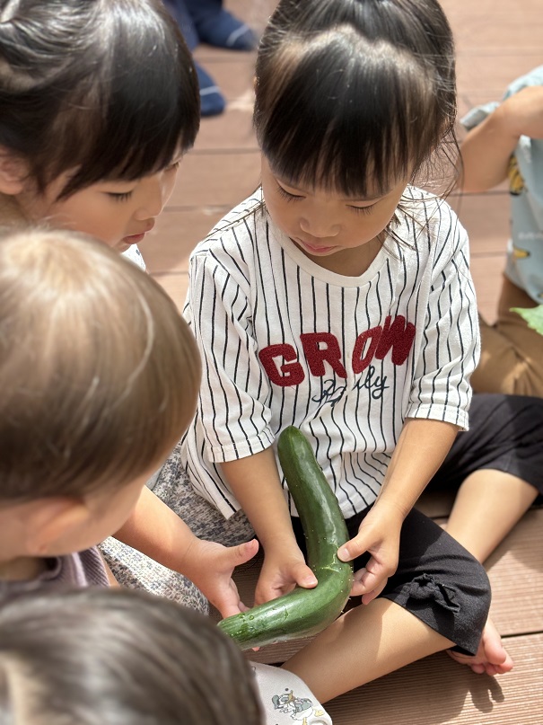 先生のお話をよく聞きながら、葉っぱのザラザラした感触や、きゅうりの表面のつぶつぶした感触など、実際に触ってじっくりと確かめながら収穫しました♪