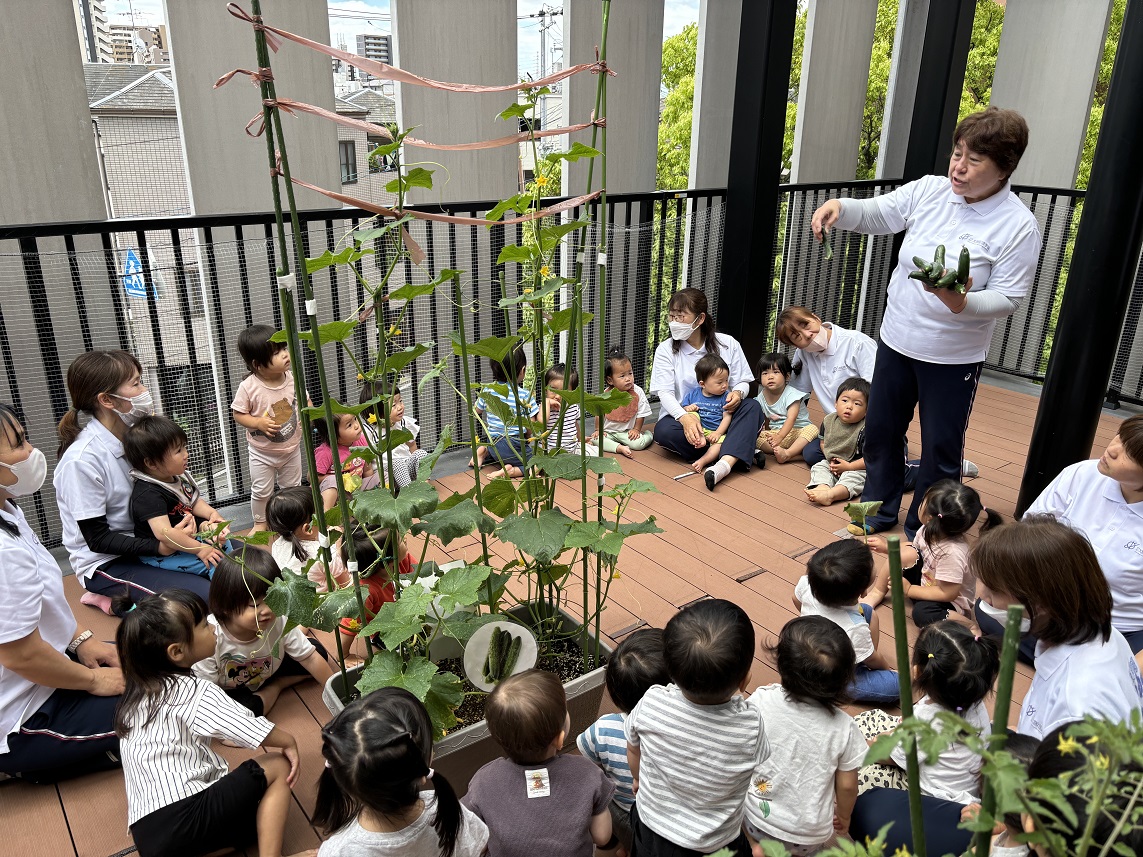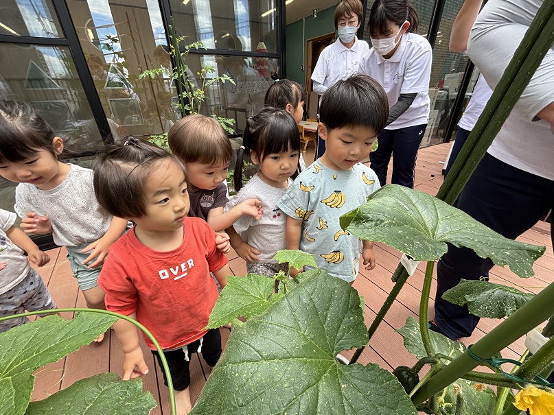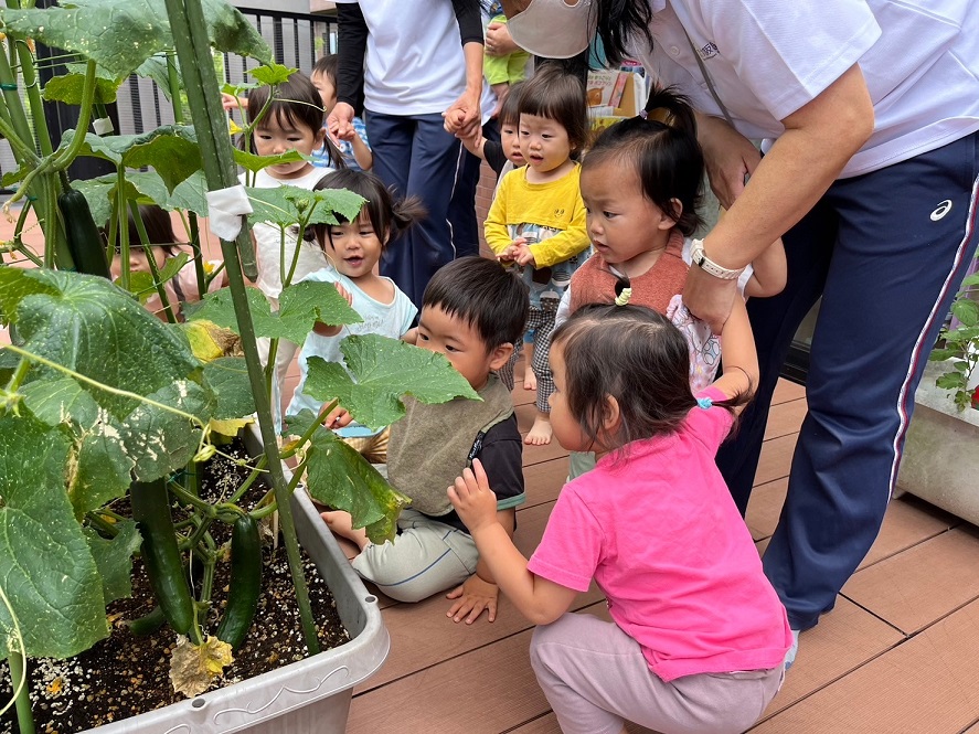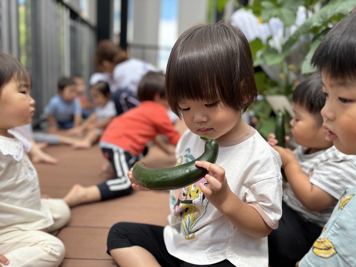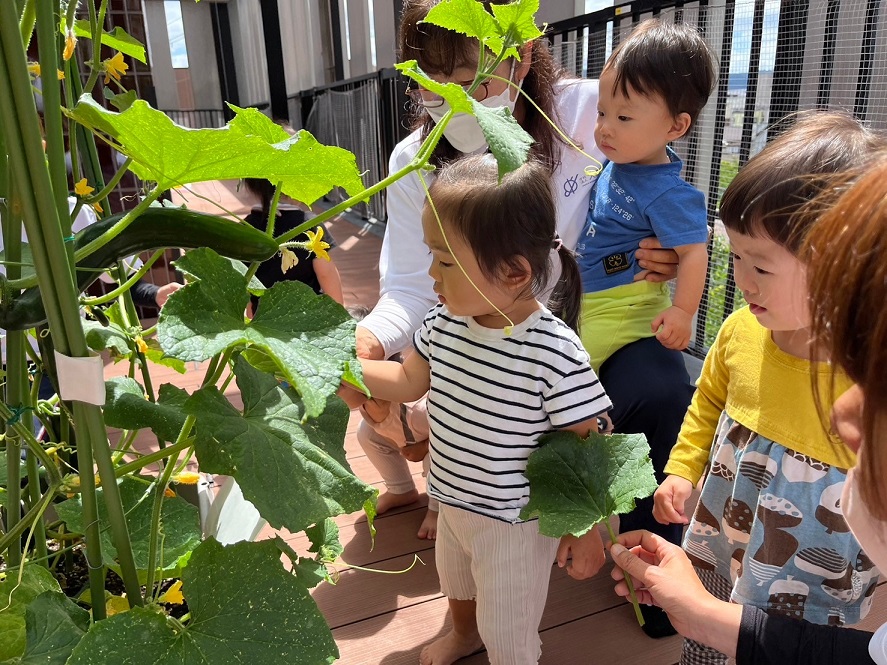 5月29日、うさぎ組、ぱんだ組の子どもたちがテラスで育てていたきゅうりを収穫しました♪