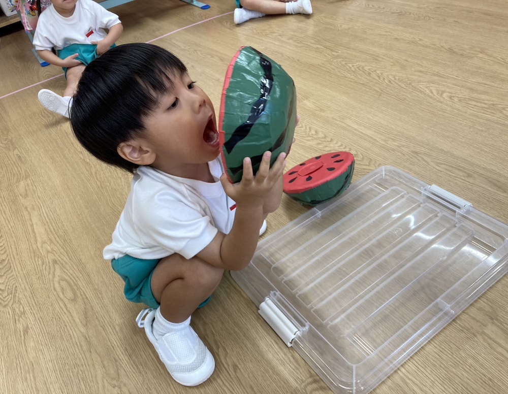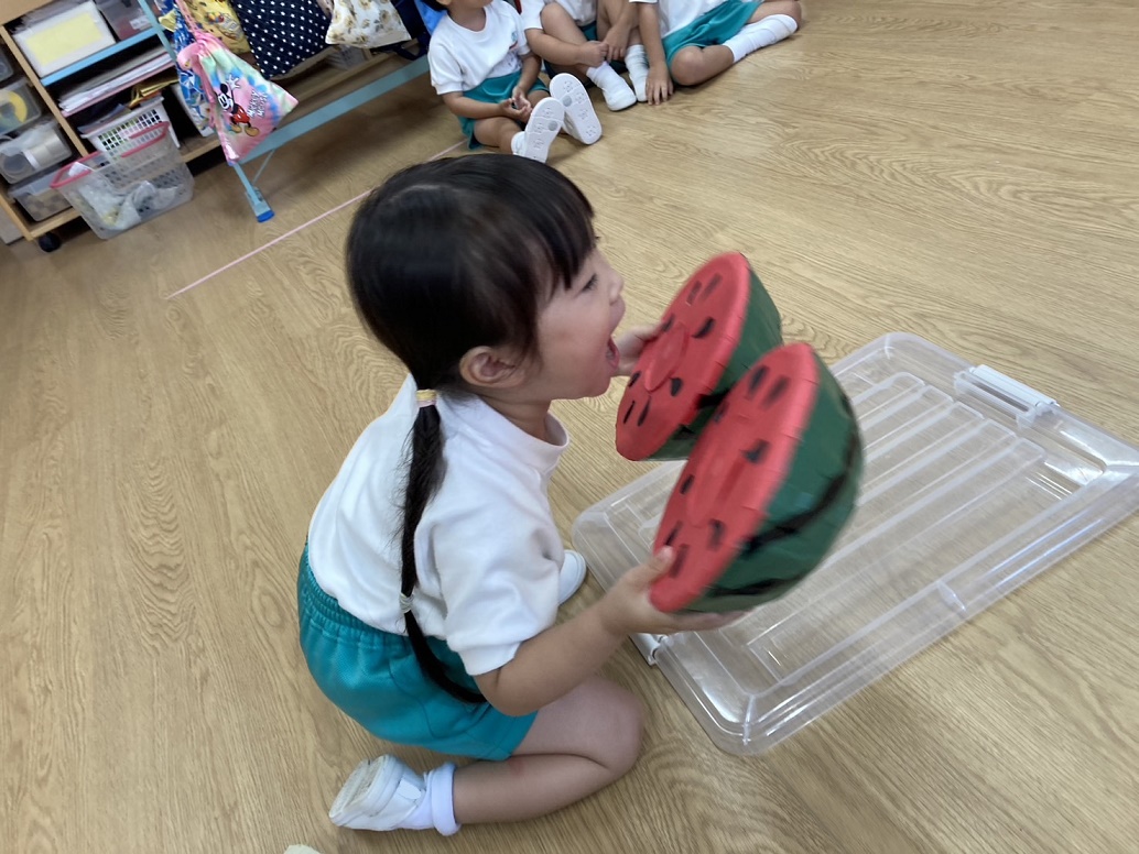 割れたスイカはパクパクと食べる真似っこ!