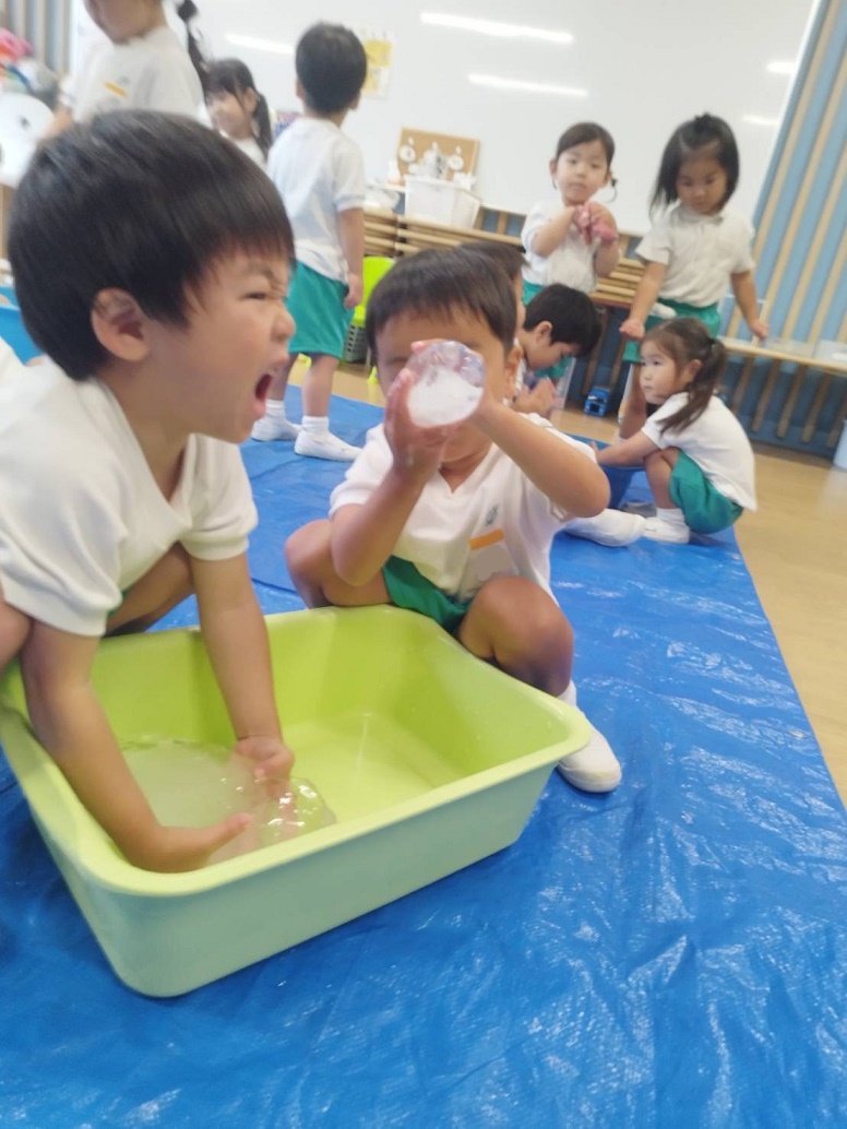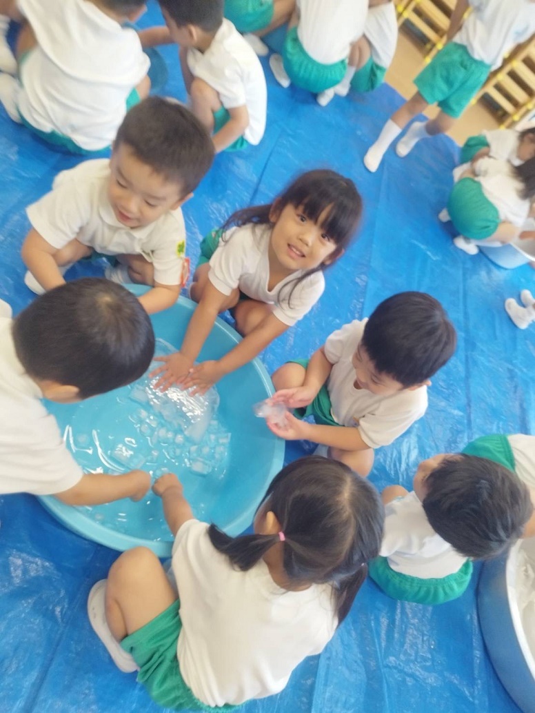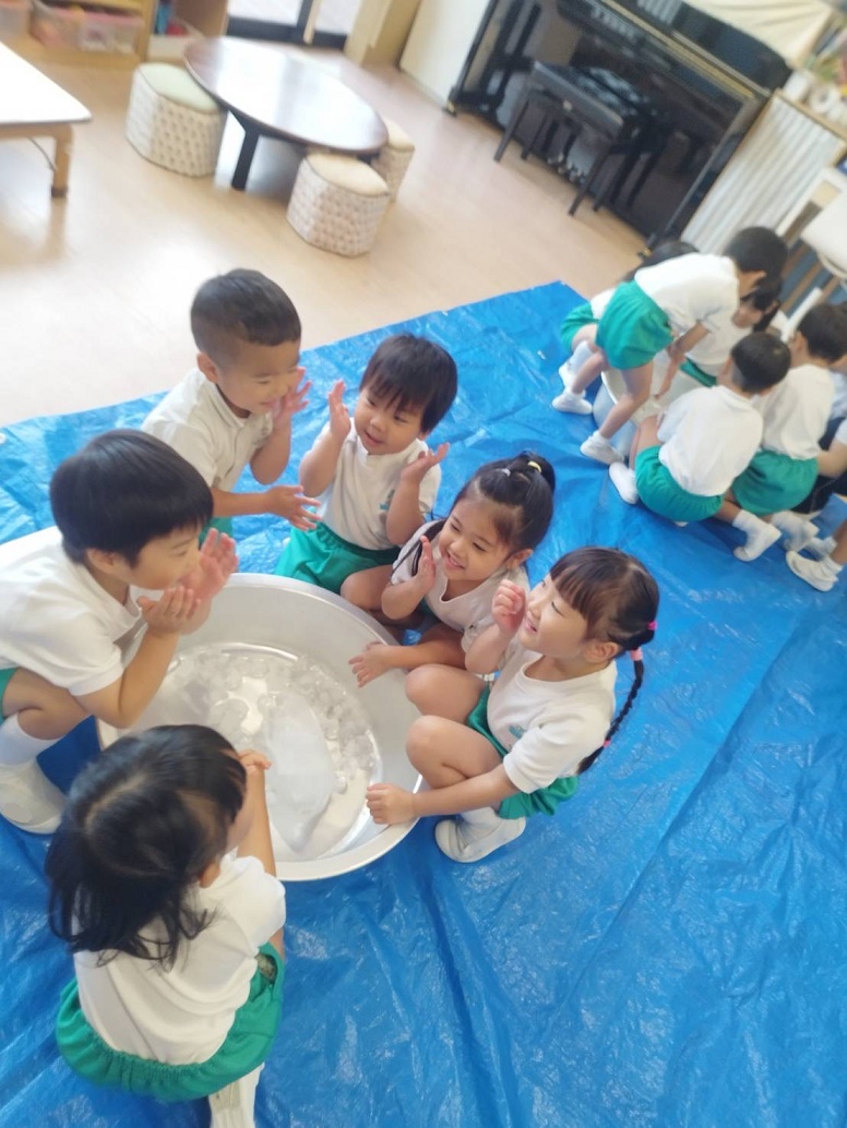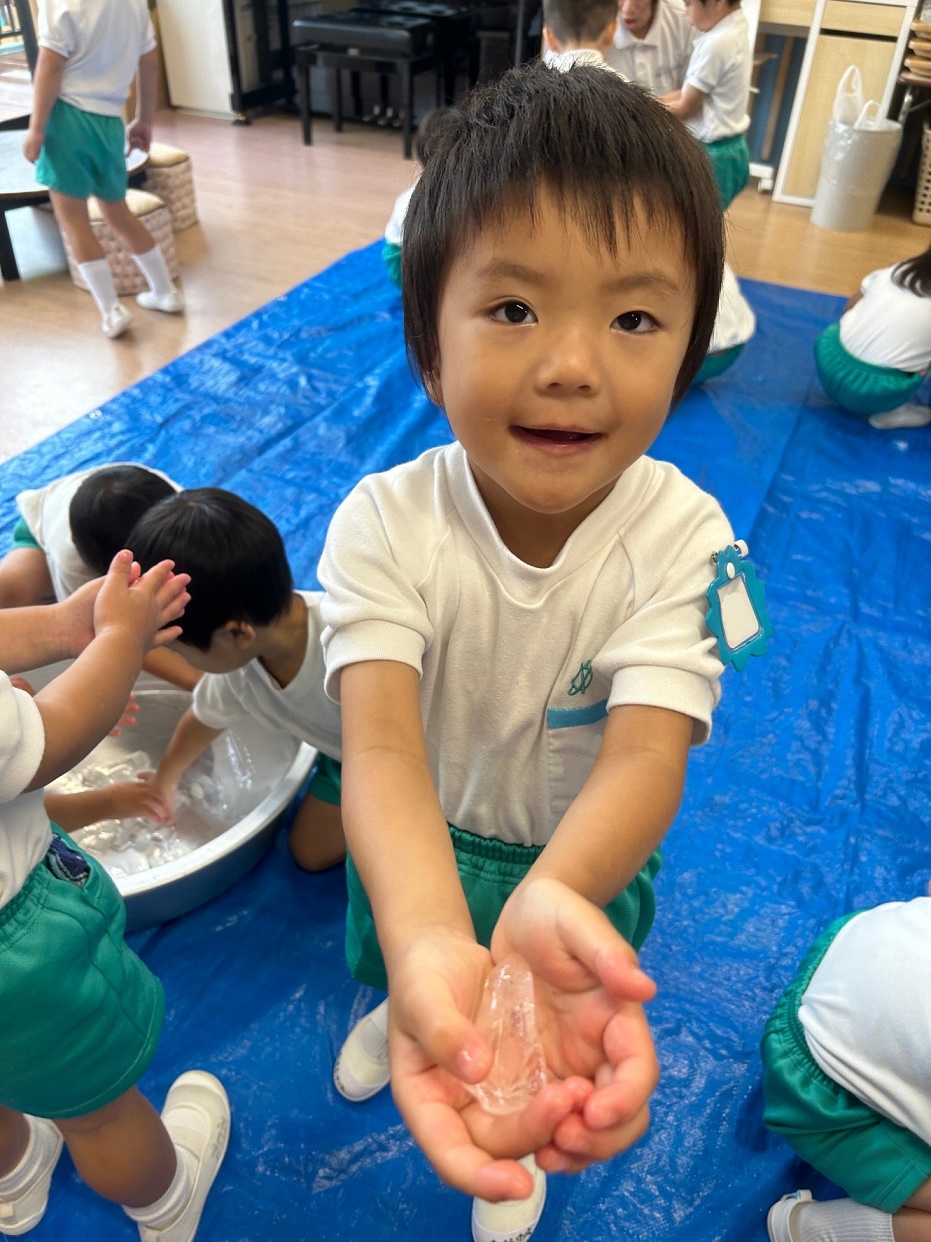 大人では冷たくてなかなか持ち続けられない氷ですが、子どもたちは楽しそうに何度も握っていましたよ!