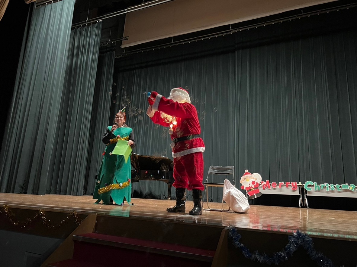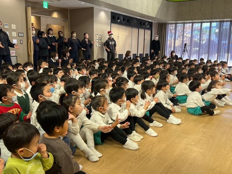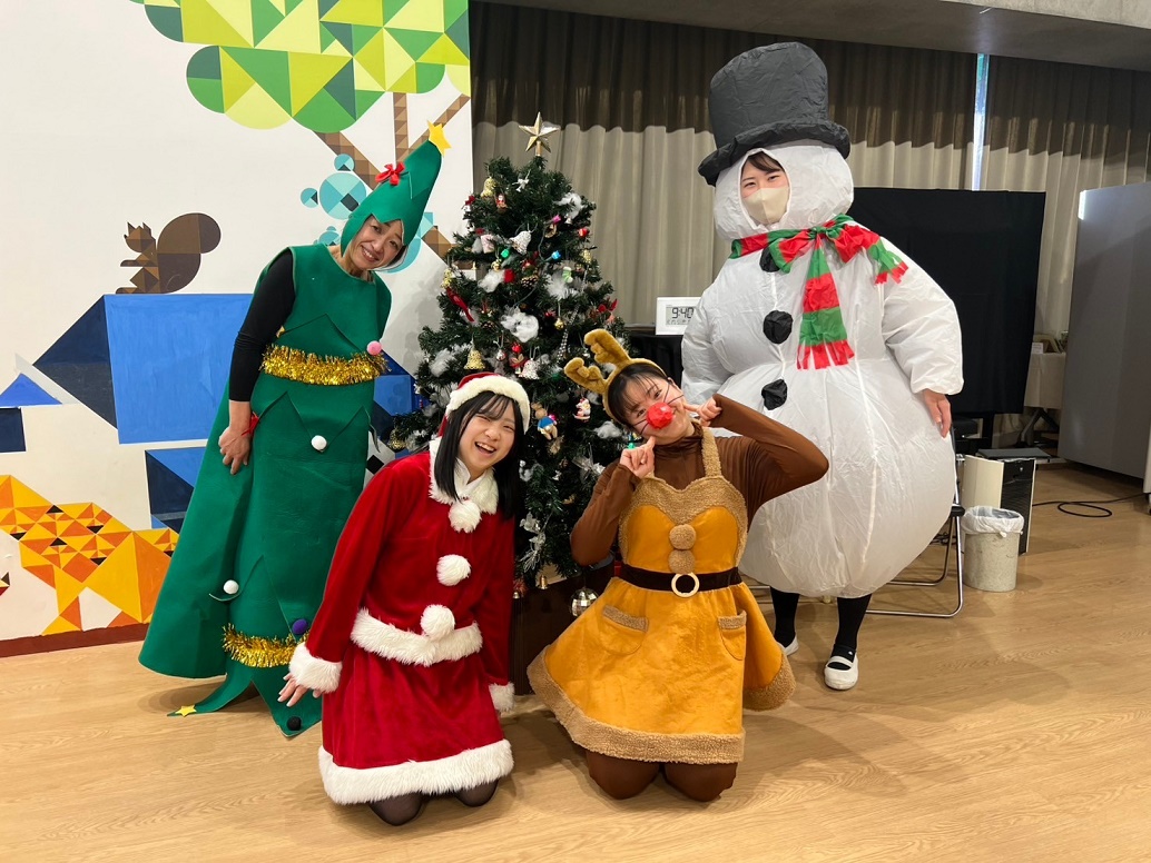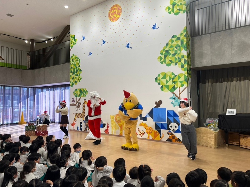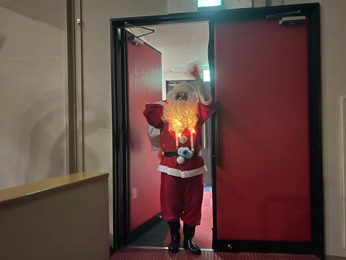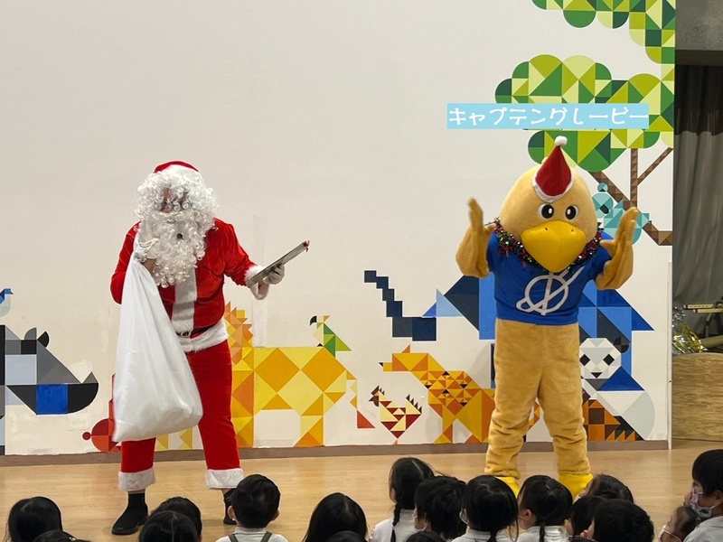 サンタさんと一緒に大学のマスコットキャラクター「キャプテングロービー」が来てくれて、一緒にダンスを踊って楽しみました♪