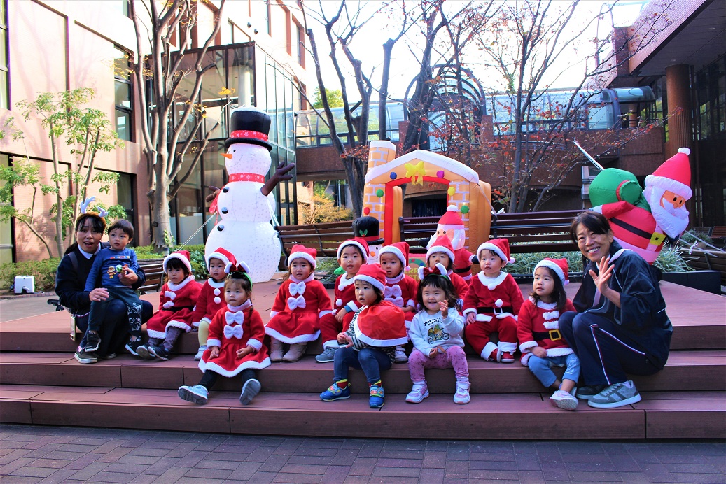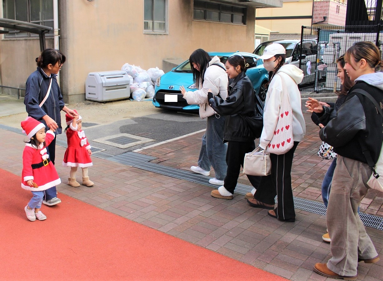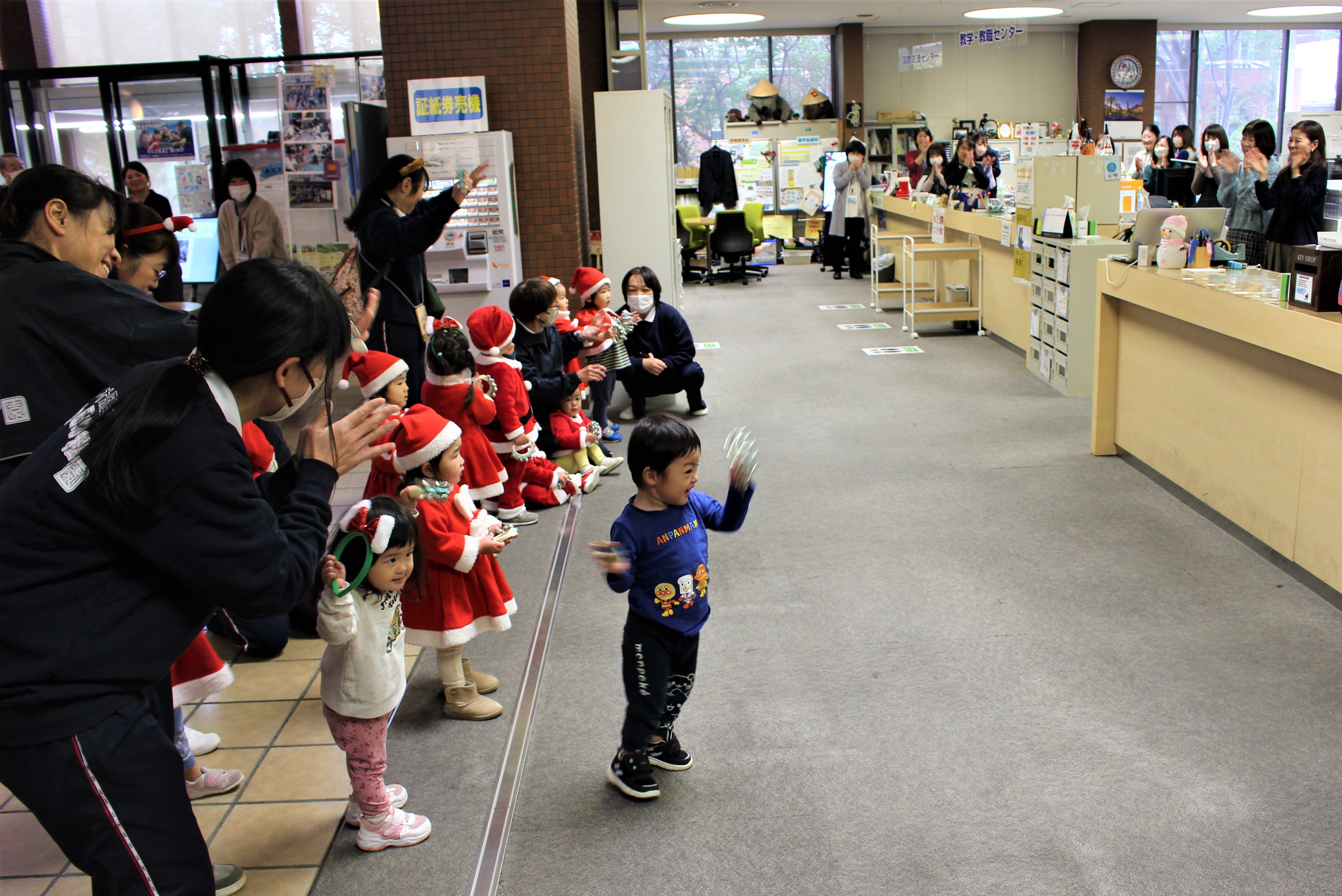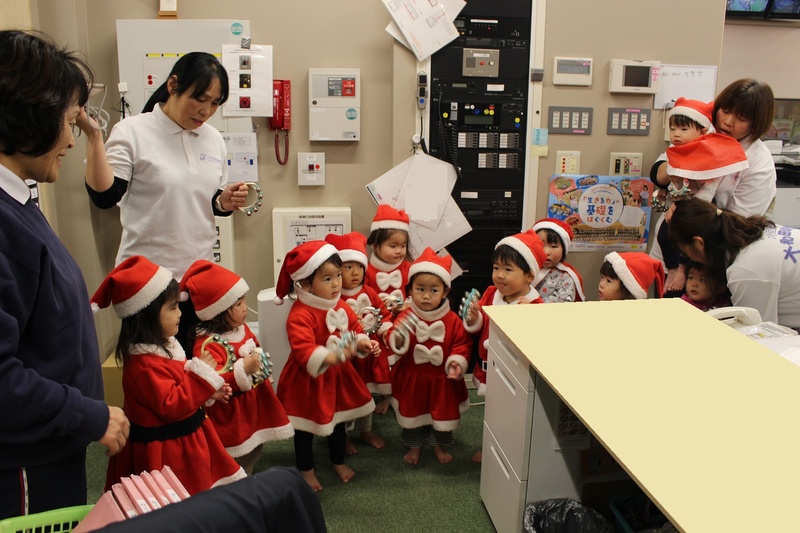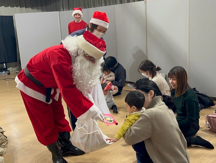 サンタさんと一緒に大学のマスコットキャラクター「キャプテングロービー」が来てくれて、一緒にダンスを踊って楽しみました♪