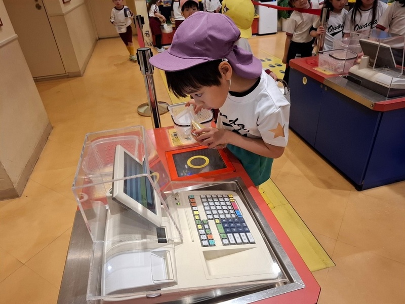 本物そっくりなスーパーのレジ打ち体験も!