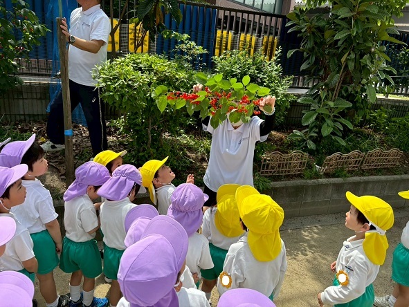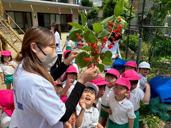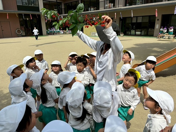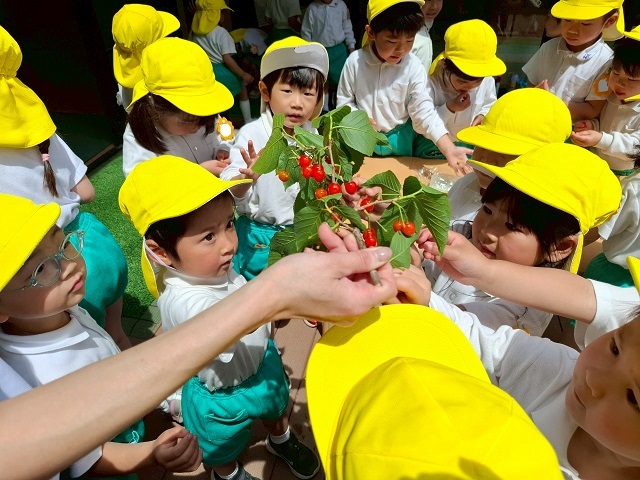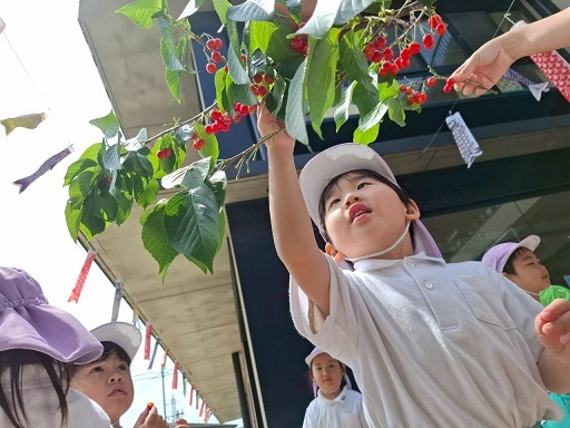 枝になってるさくらんぼを見て大興奮の子どもたち。