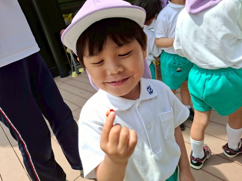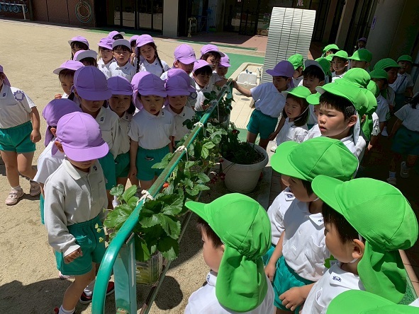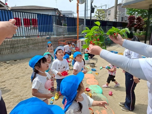 5月7日 幼稚園で育てているいちごが真っ赤になっているのを見つけた