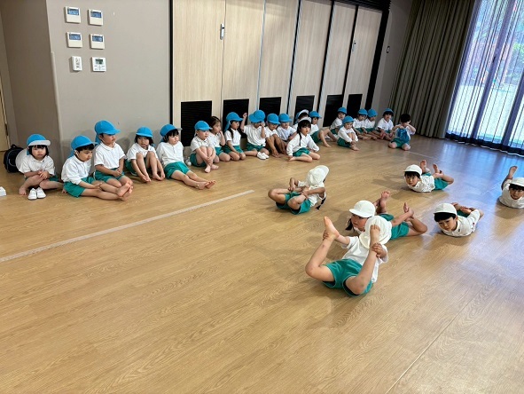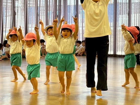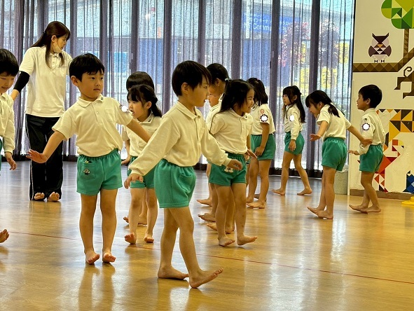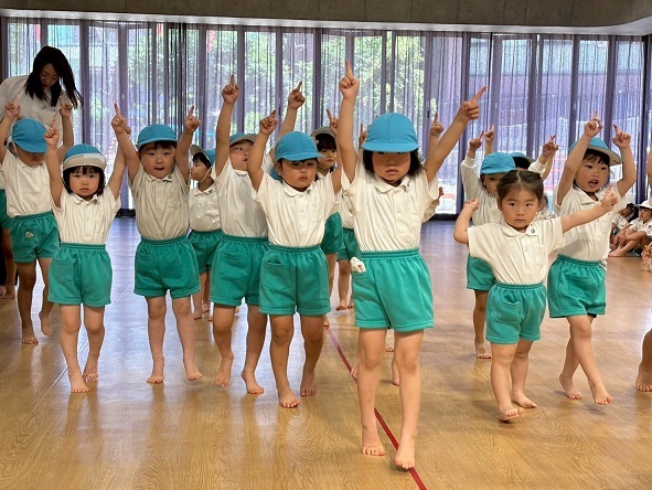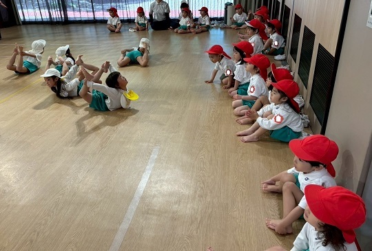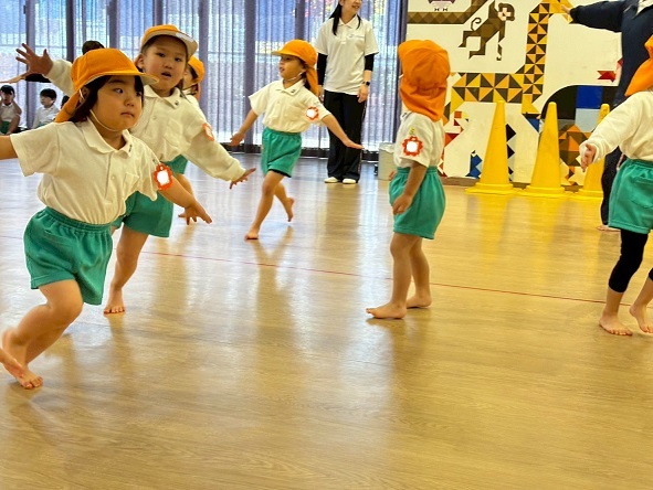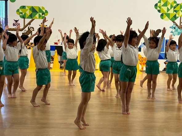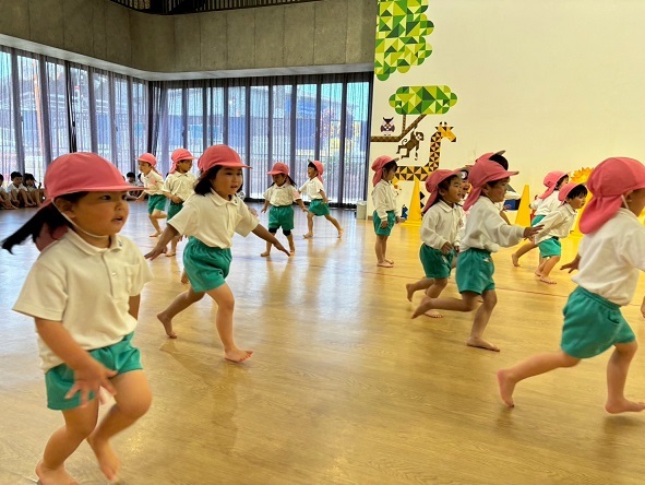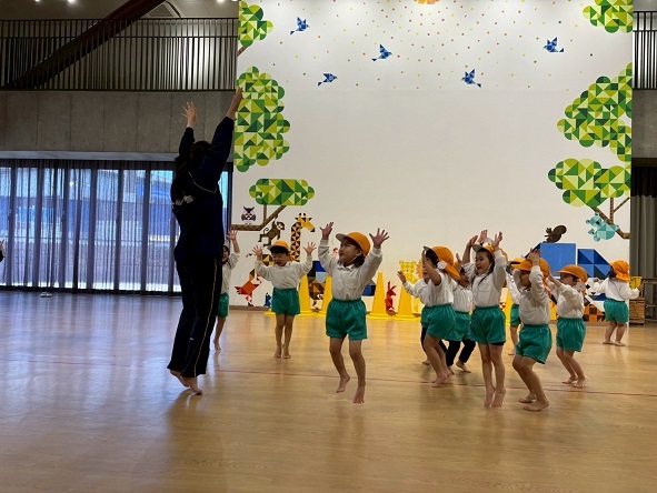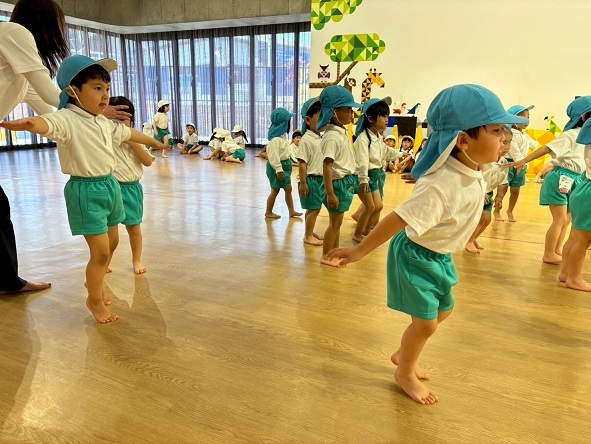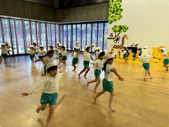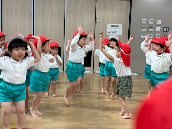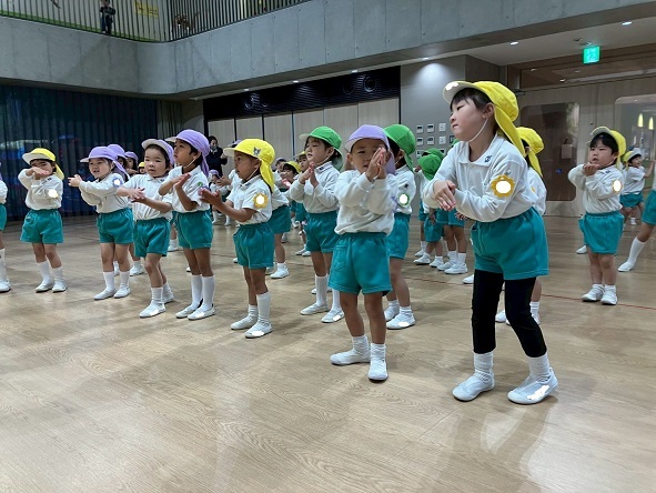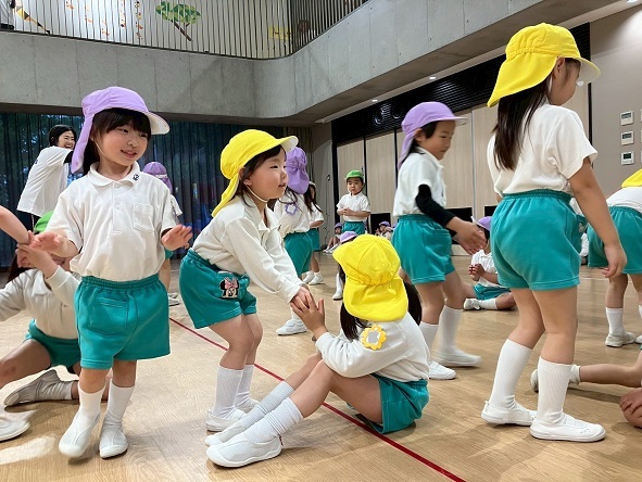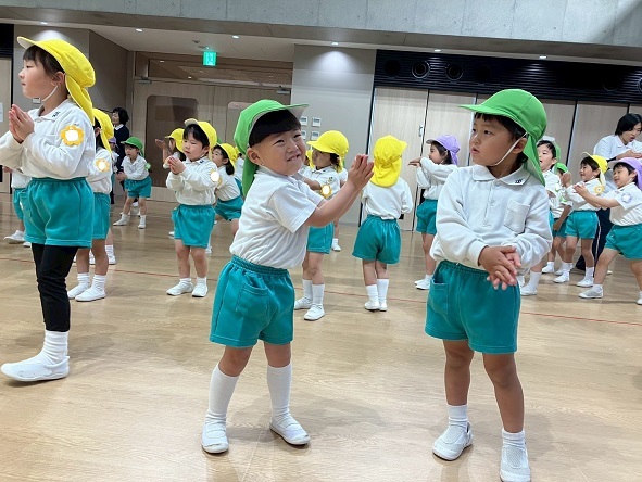 年長組さんと年少組さんは、幼稚園のホールでリズムあそびをしました!