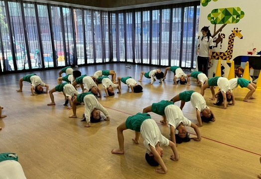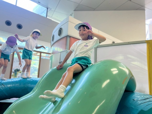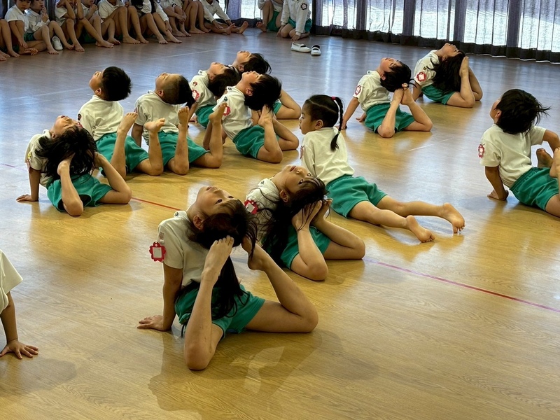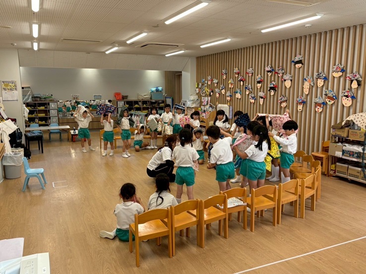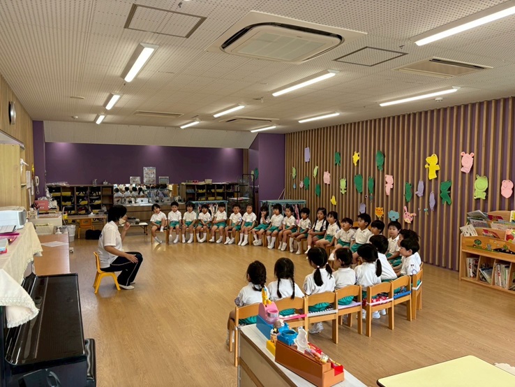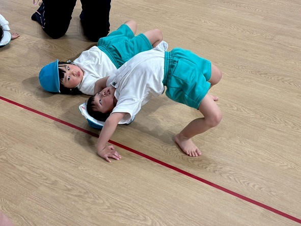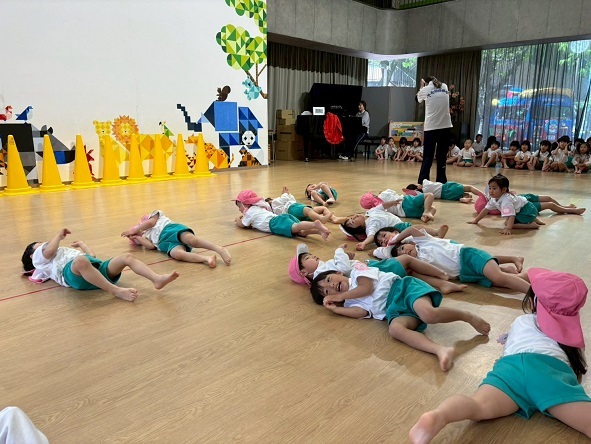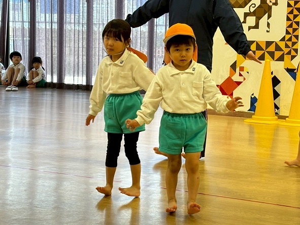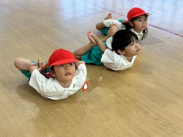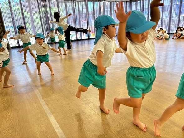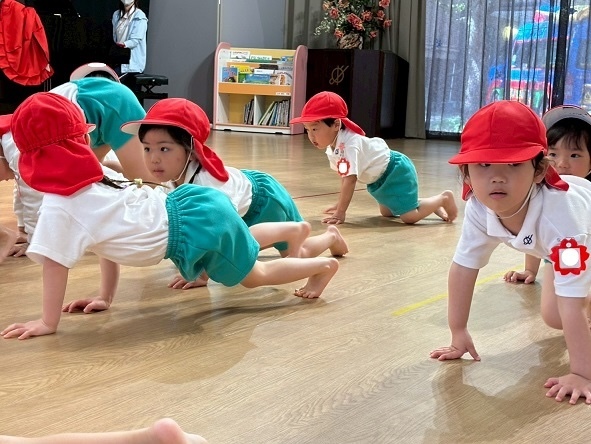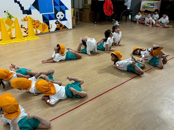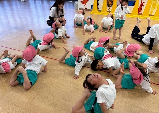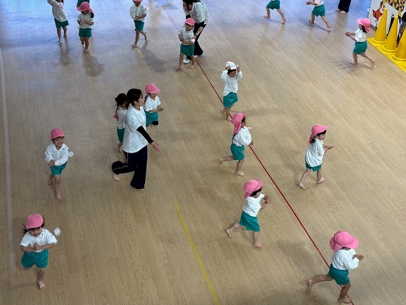 年長組さんと年少組さんは、幼稚園のホールでリズムあそびをしました!