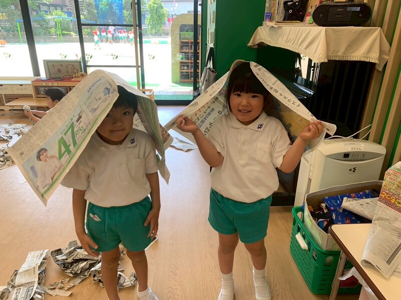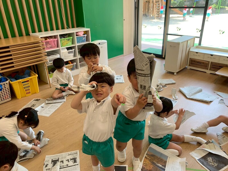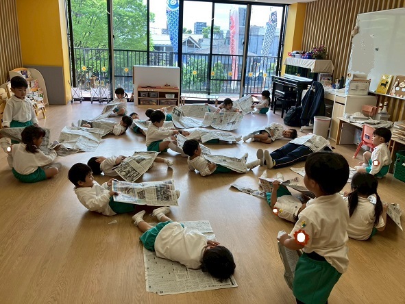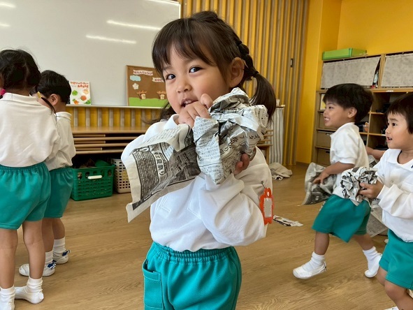 新聞あそびをしました! 丸めたり、くしゃくしゃにしてみたり