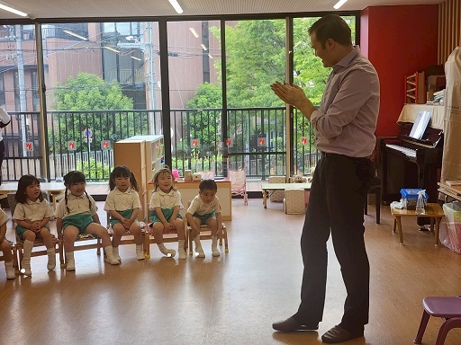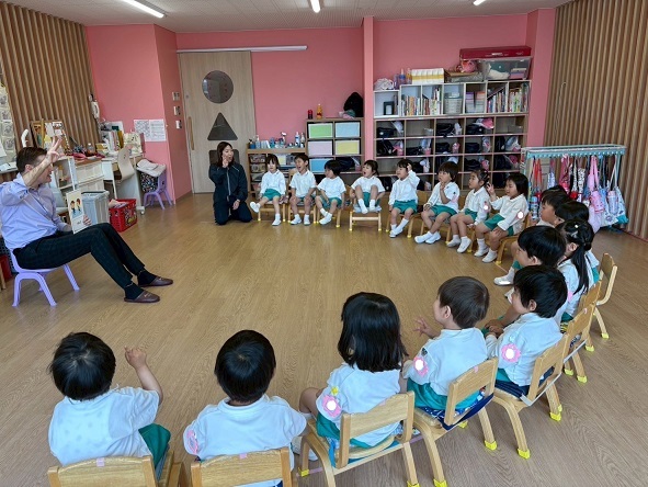 5月7日 年少組さんは、はじめての英語がありました。
