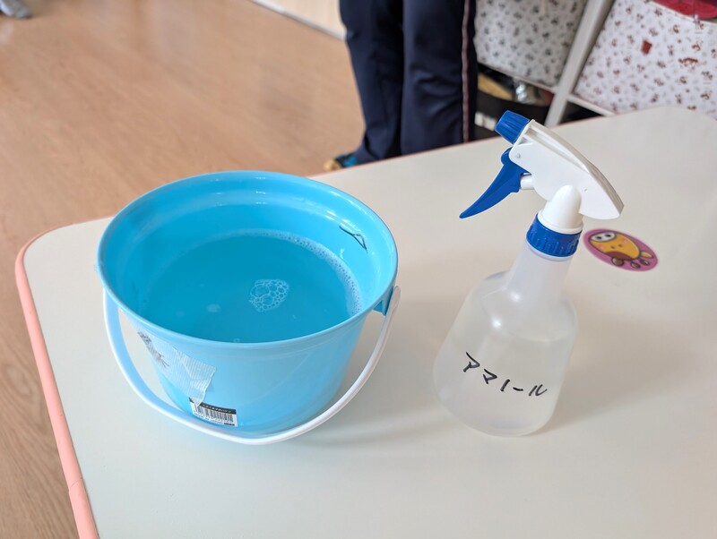消毒には看護師の指導の下、次亜塩素酸ナトリウムとアルコール消毒液を