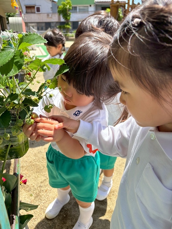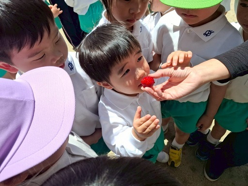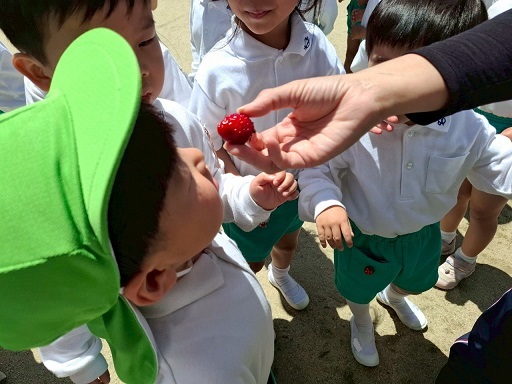 真っ赤ないちごにさわってみり、においをかいでみたり、みんな夢中です。