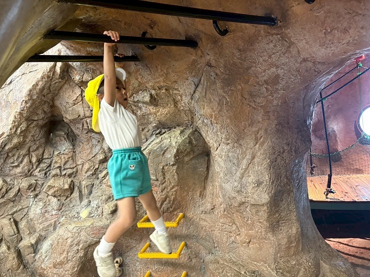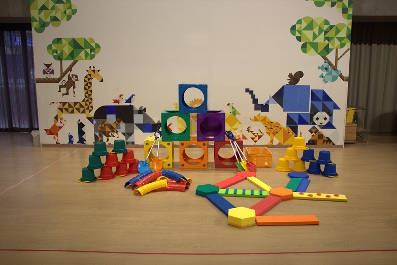 マットとフープで作ったトンネルをくぐったり、斜面マットを登ったり