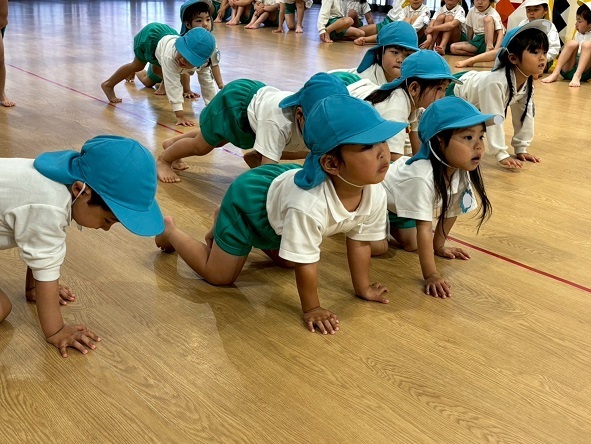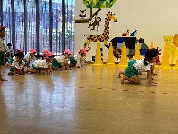 腕や足をまっすぐにのばして、つま先やかかとで歩いて身体を大きく使って動物になりきりました。