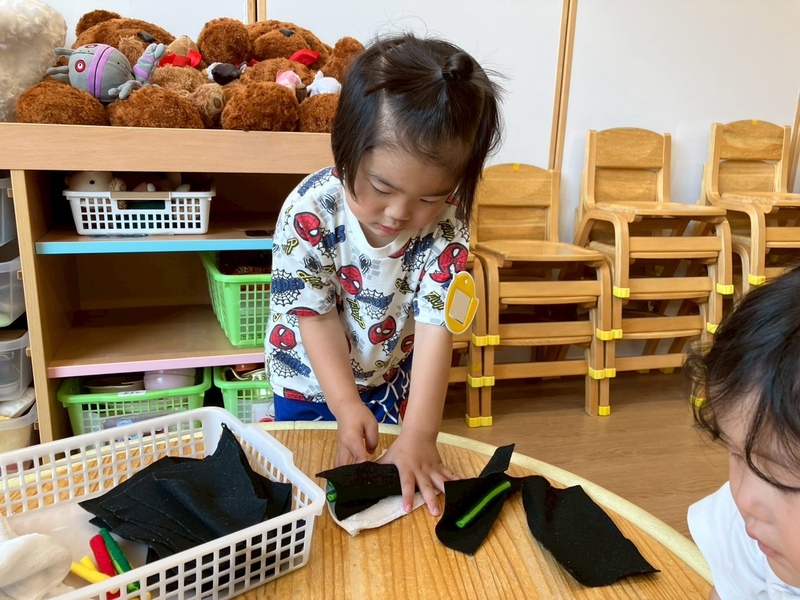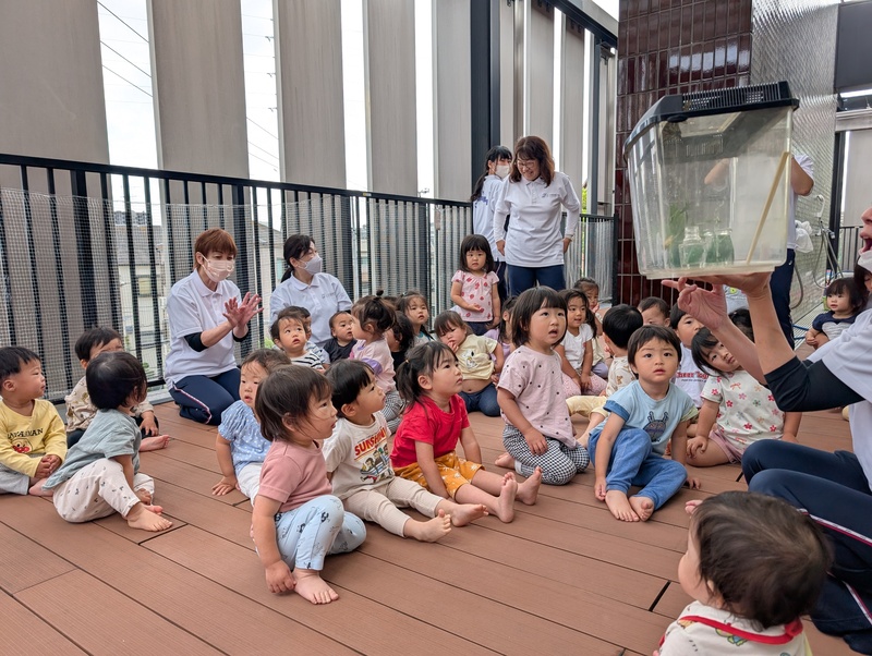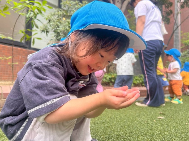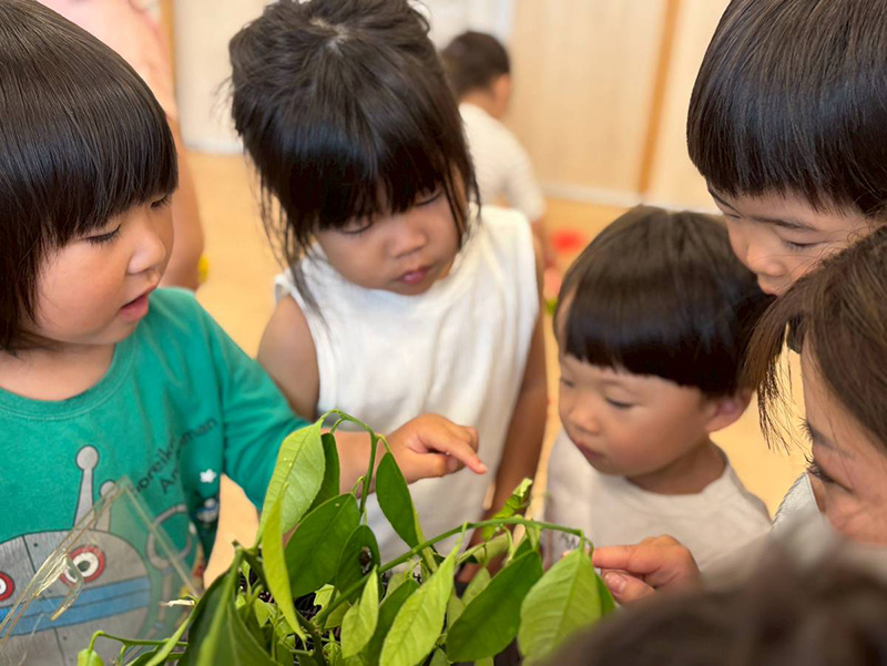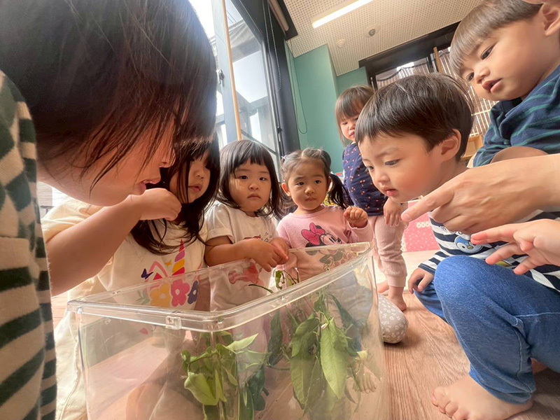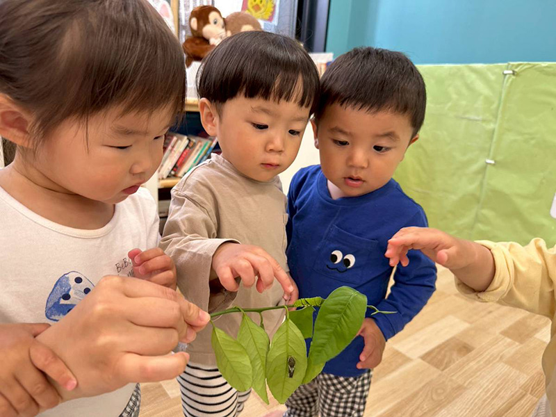ぱんだ・うさぎ組さんは観察ケースから青虫を取り出して見てみました。