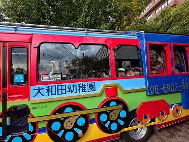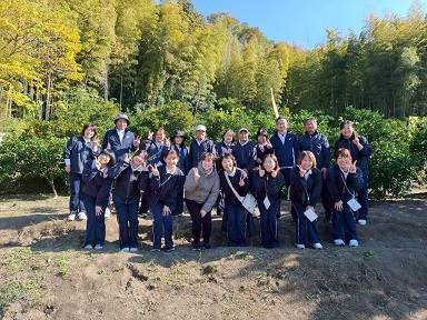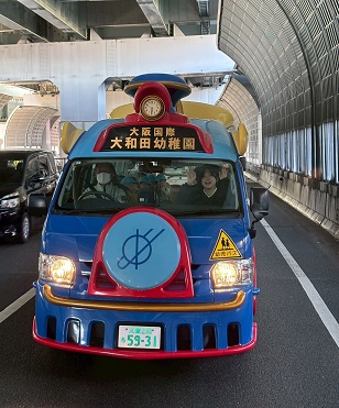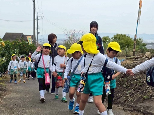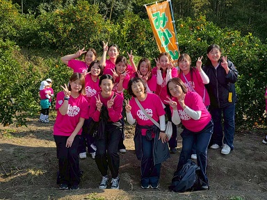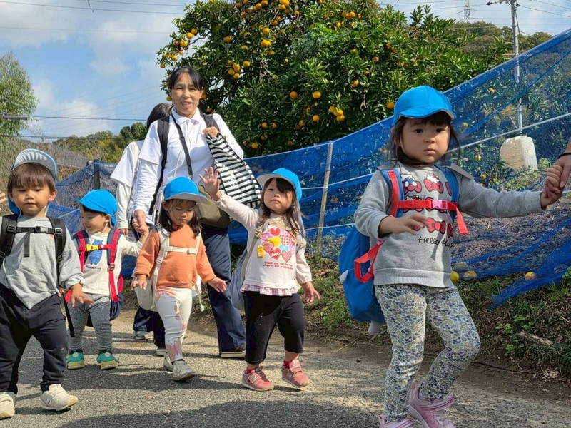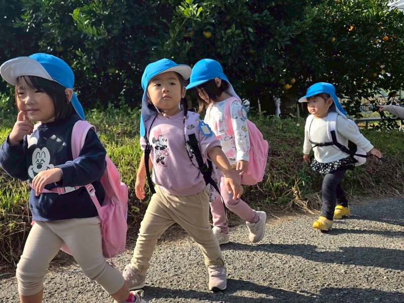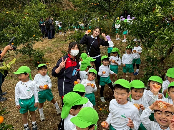大学と幼稚園のバスに分かれて乗車し、みかん畑へ出発。