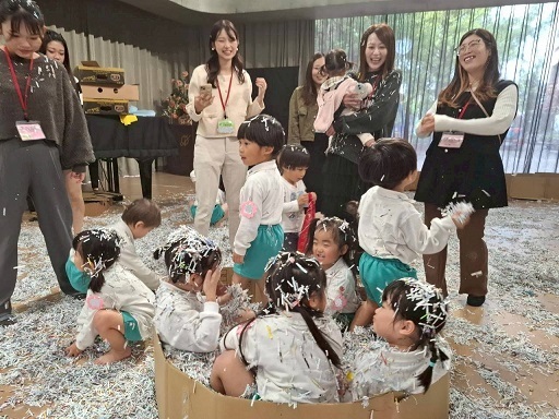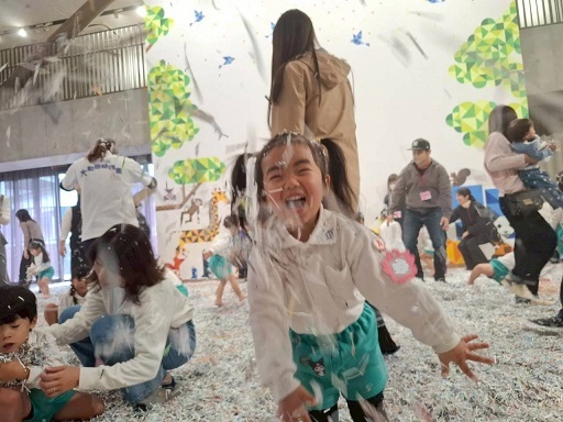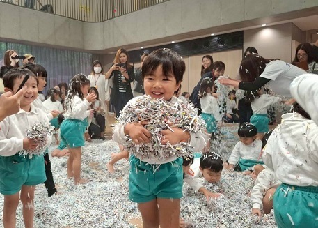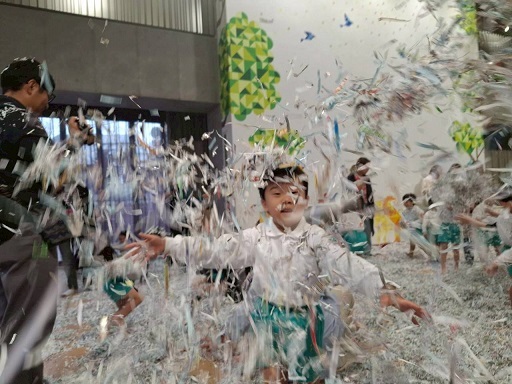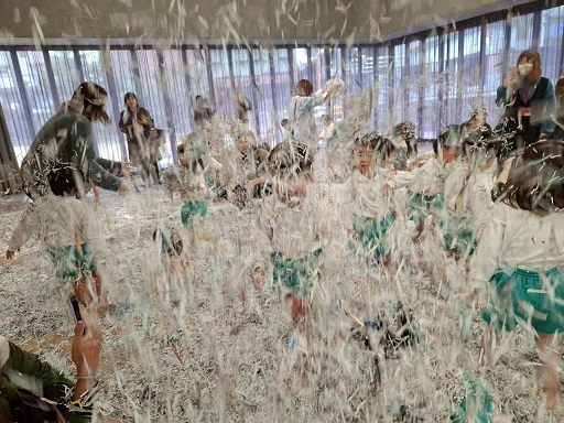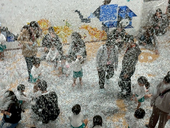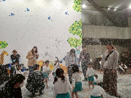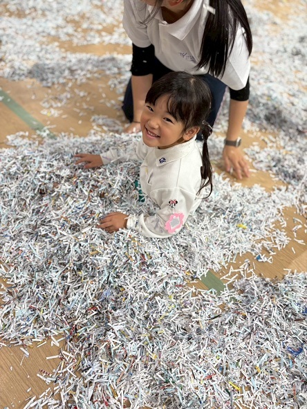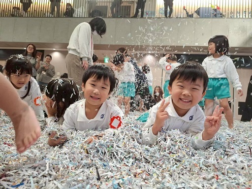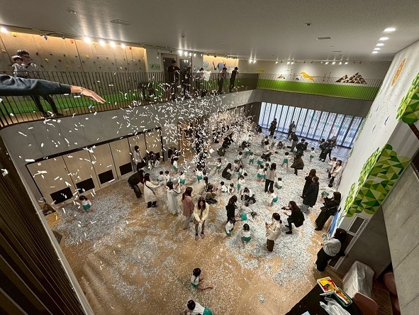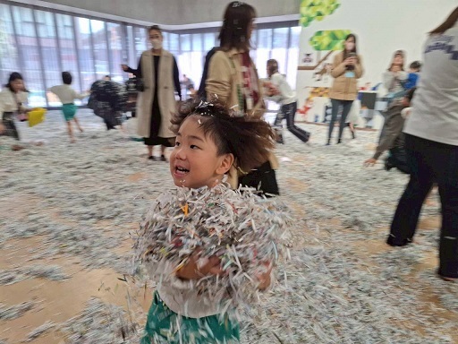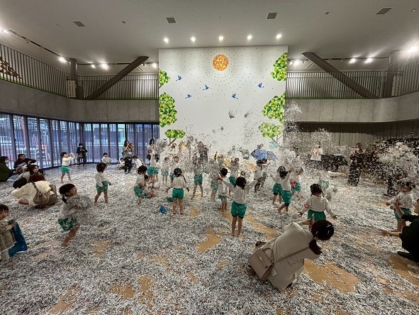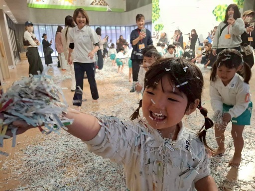 広いホールいっぱいのシュレッダーで遊ぶ子どもたちの生き生きとした表情をご覧ください。