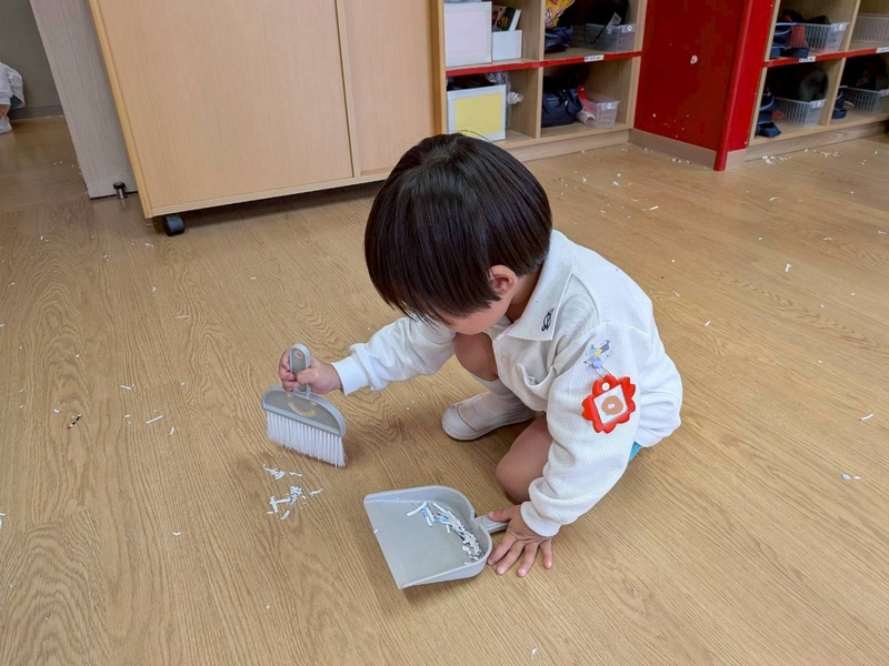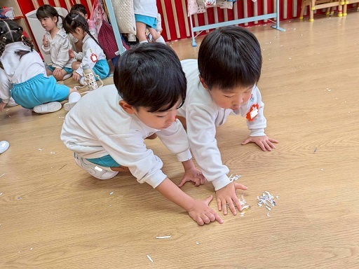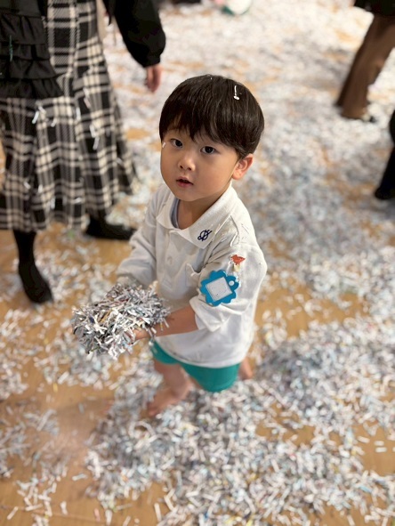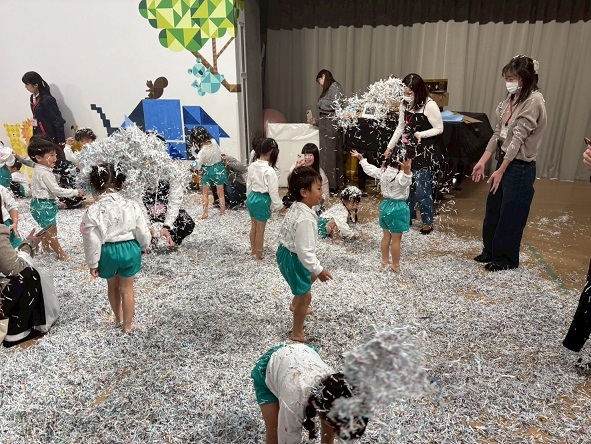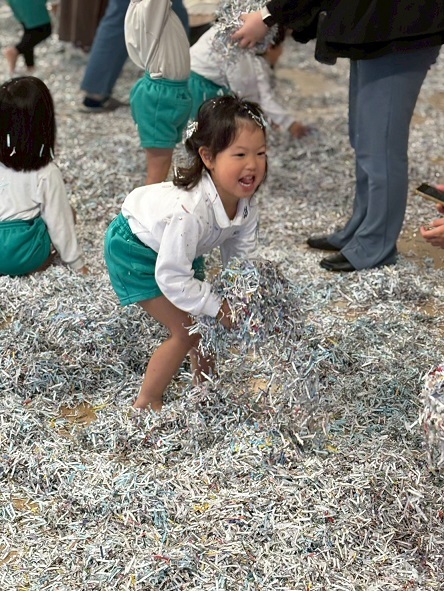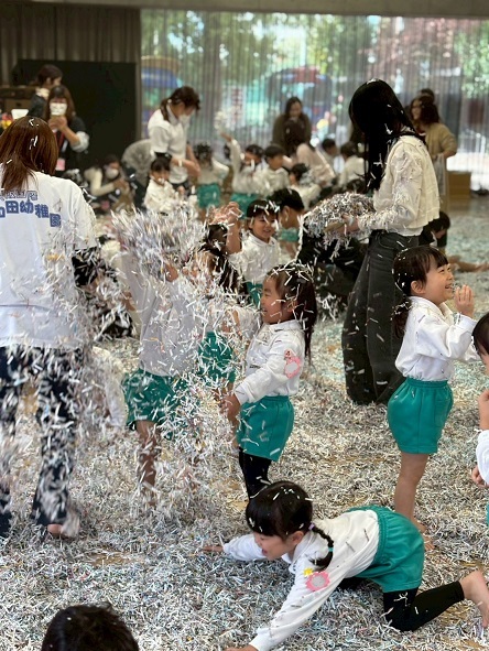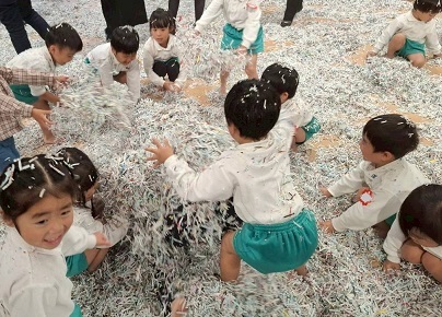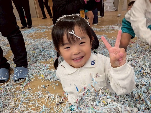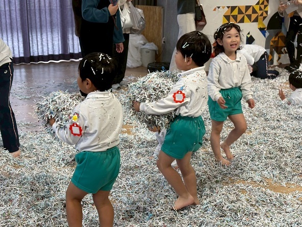 11月6日 年少組の保育参観は、幼稚園ホールでシュレッダー遊びをしました。