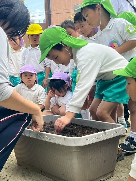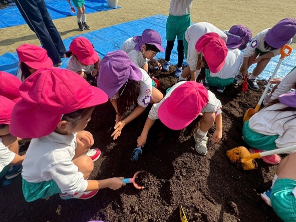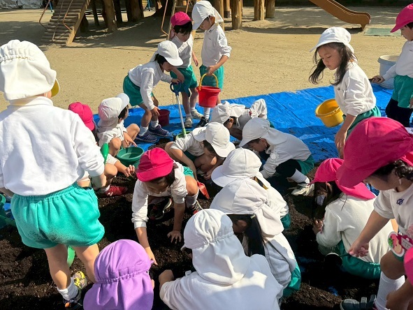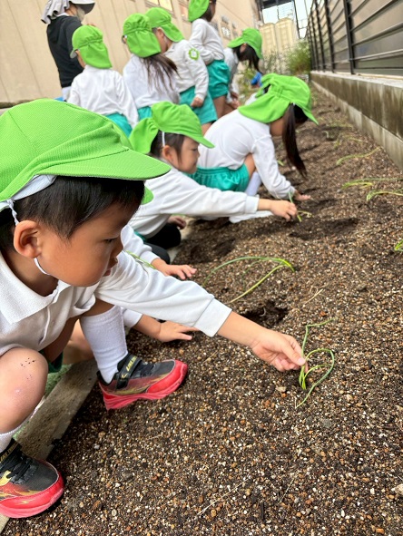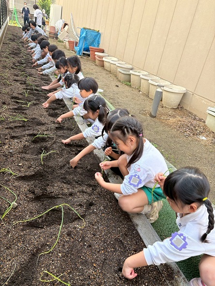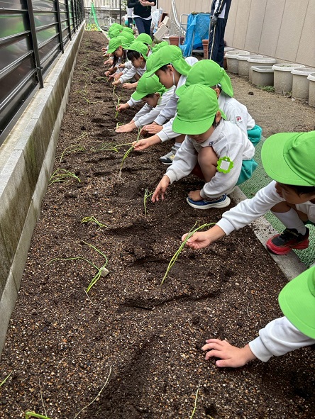 年中組は、幼稚園の畑にたまねぎの苗を植えました!