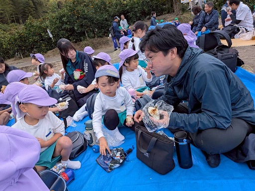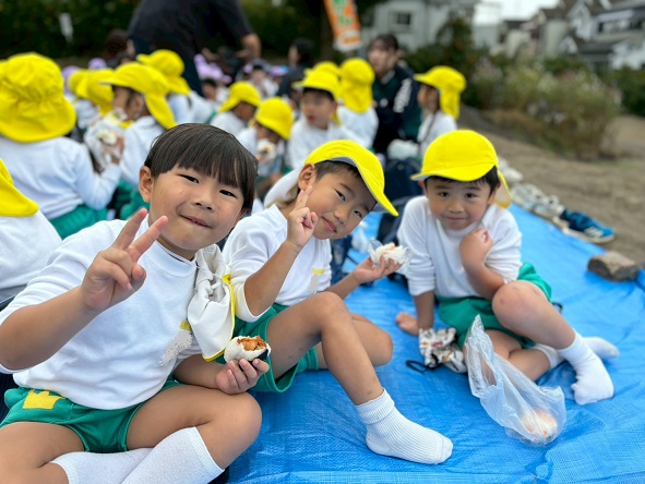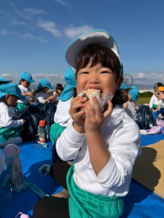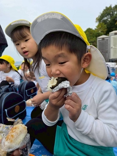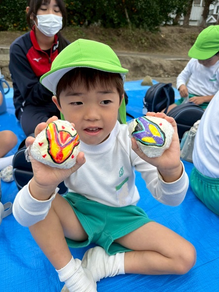 『おいしいね~』『ウインナーはいってるねん』とおにぎりをほおばってみんなニコニコ顔です。