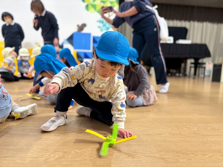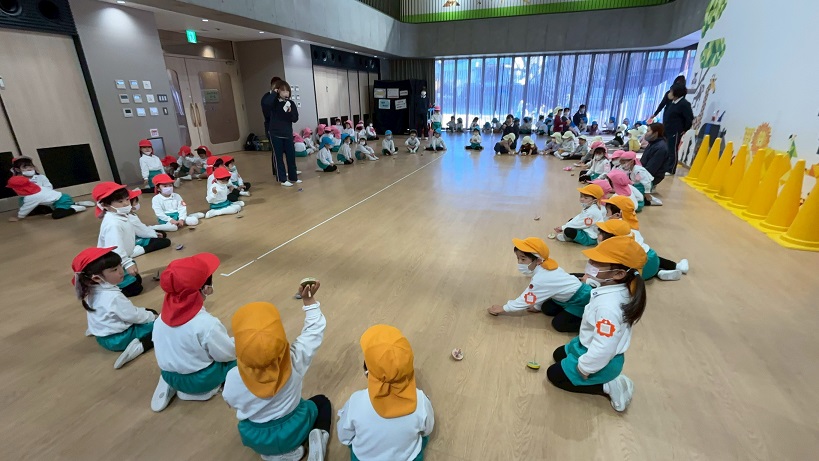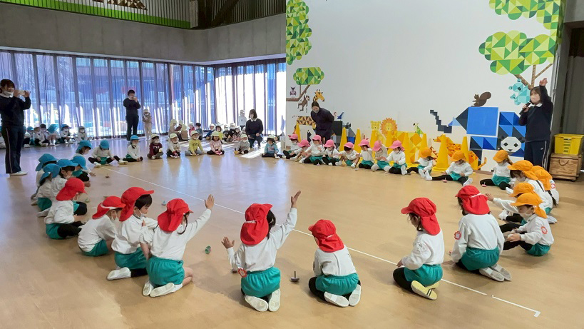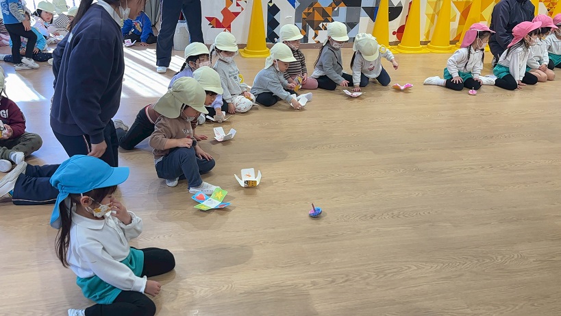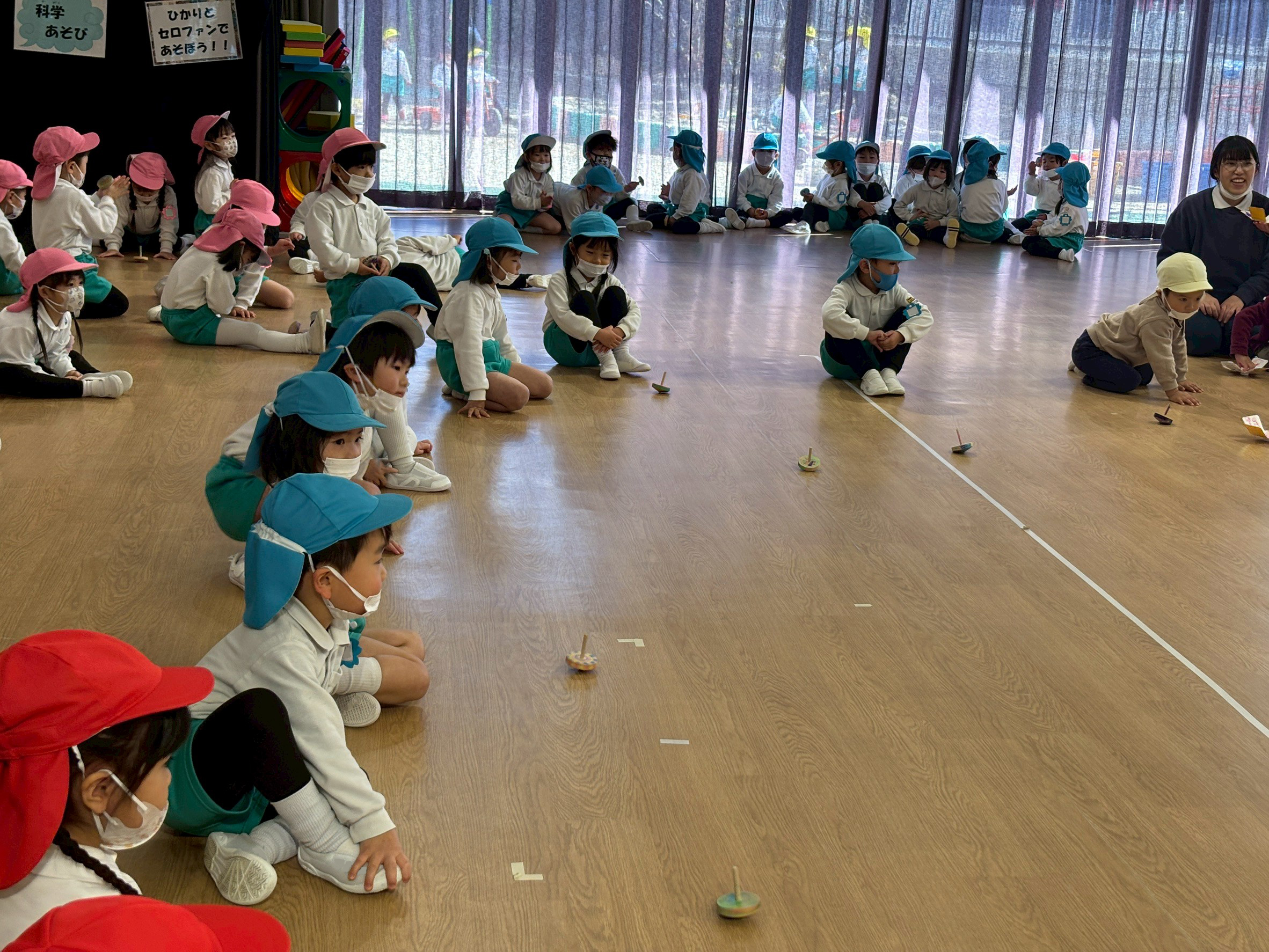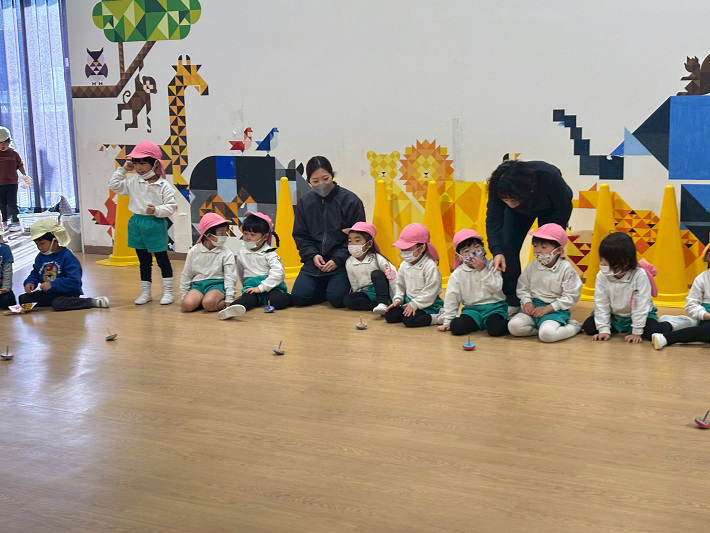 1月21日 年少組とひよこ組、ぱんだ組のみんなで、こま回し大会をしました!