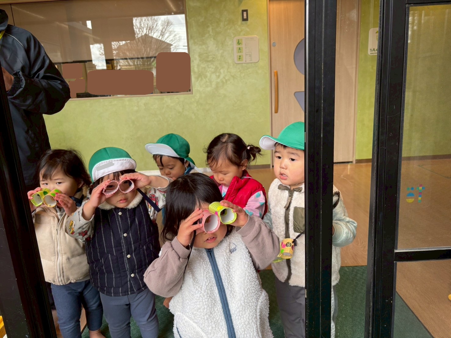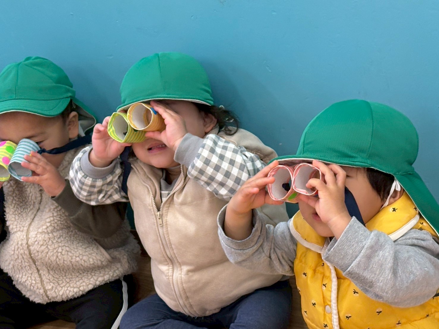 紙で手作りした双眼鏡を持って探検へお出かけ。