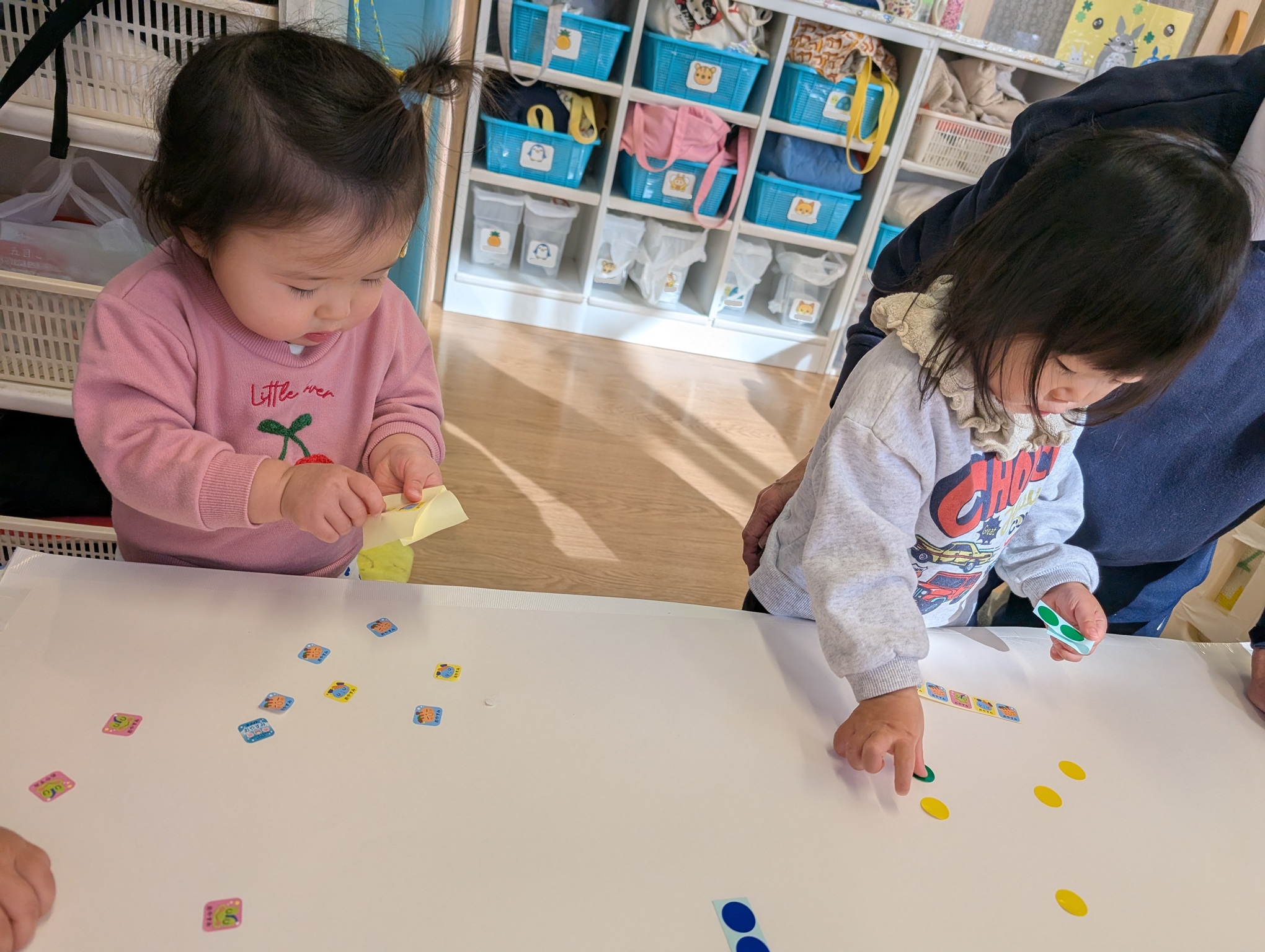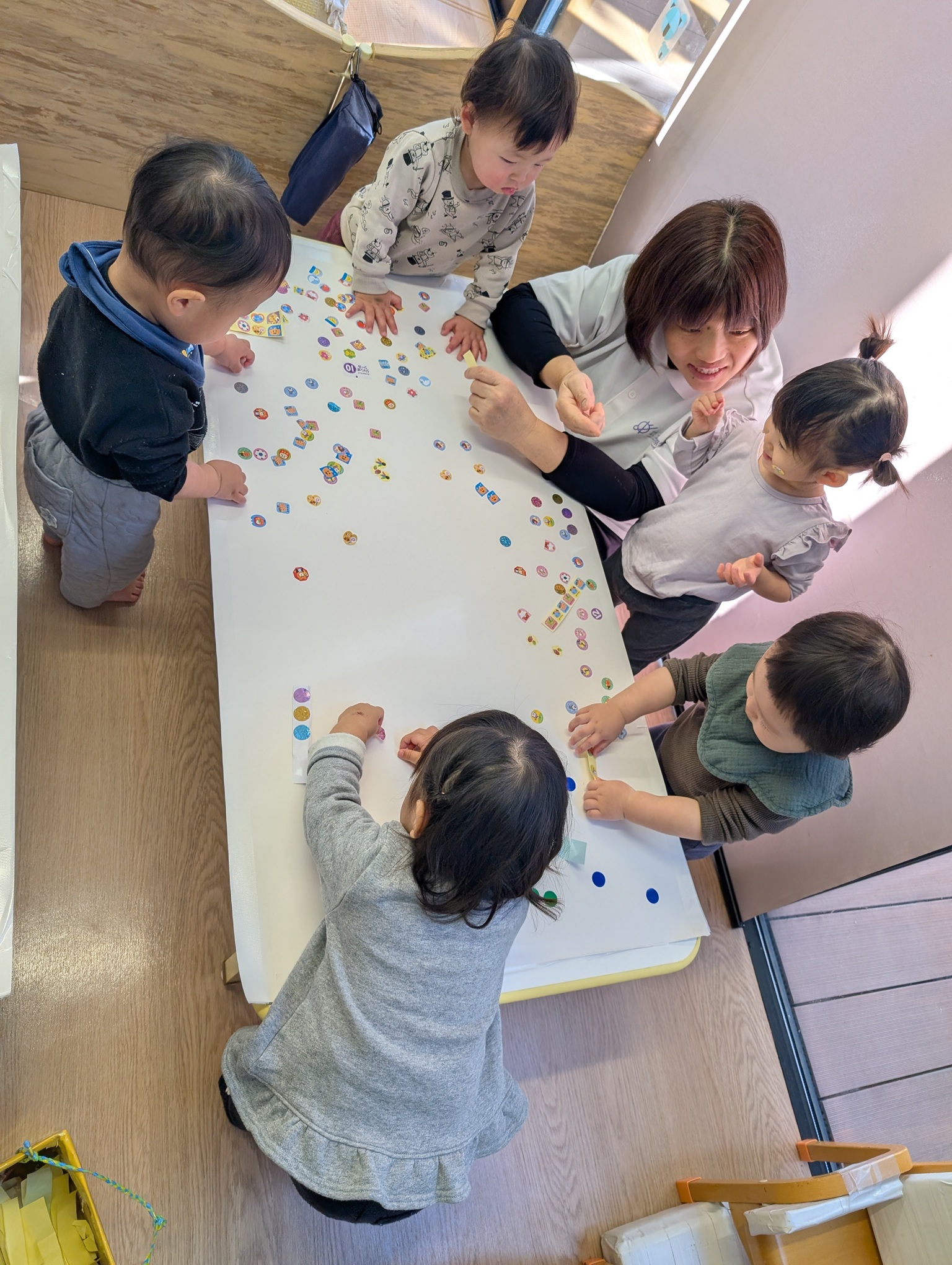 シール遊びをしました。担任の予想では「10分ぐらいで飽きるかなぁ」と