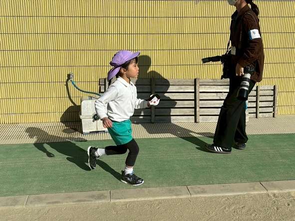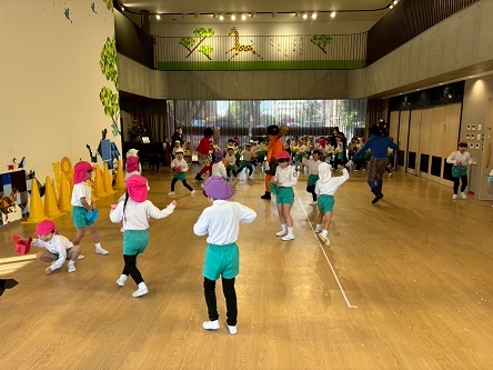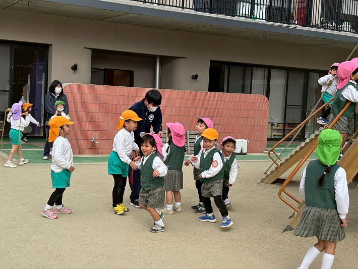 グラウンドへは、年少組さんが、ひよこ組さんやぱんだ組さんと手をつないでくれました(^^)