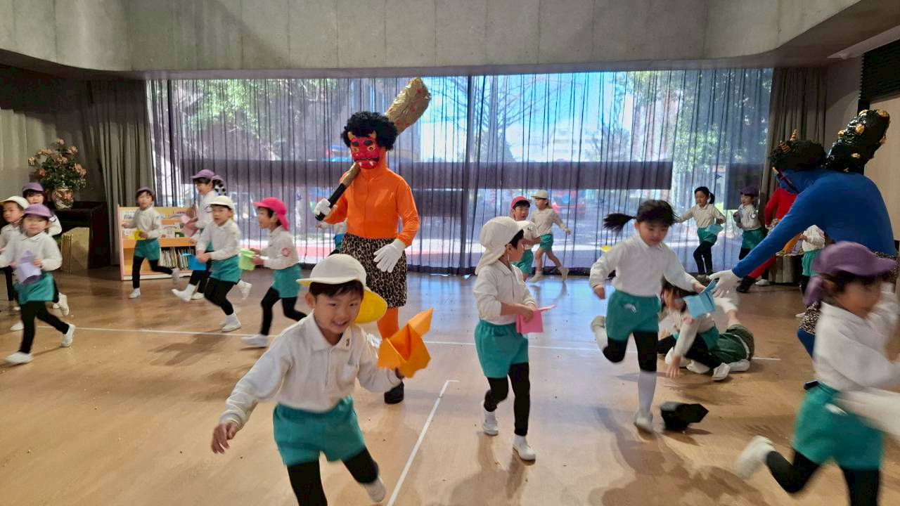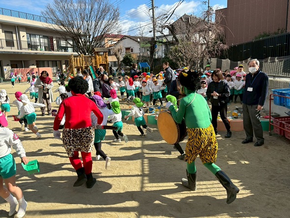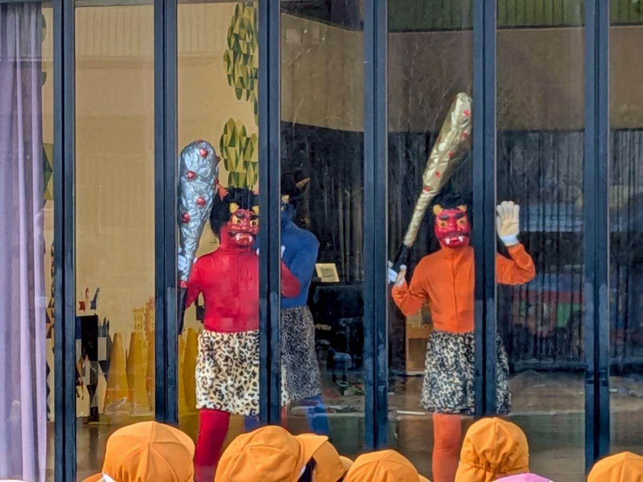 幼稚園ホールに現れた鬼は、年長組さんが豆を投げ、追い出してくれました!